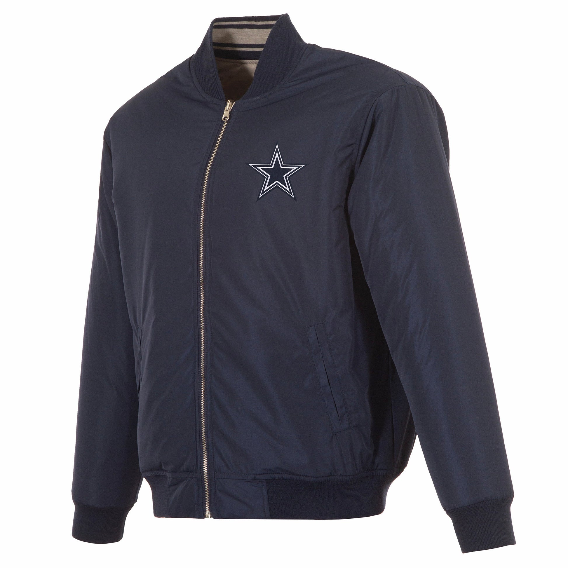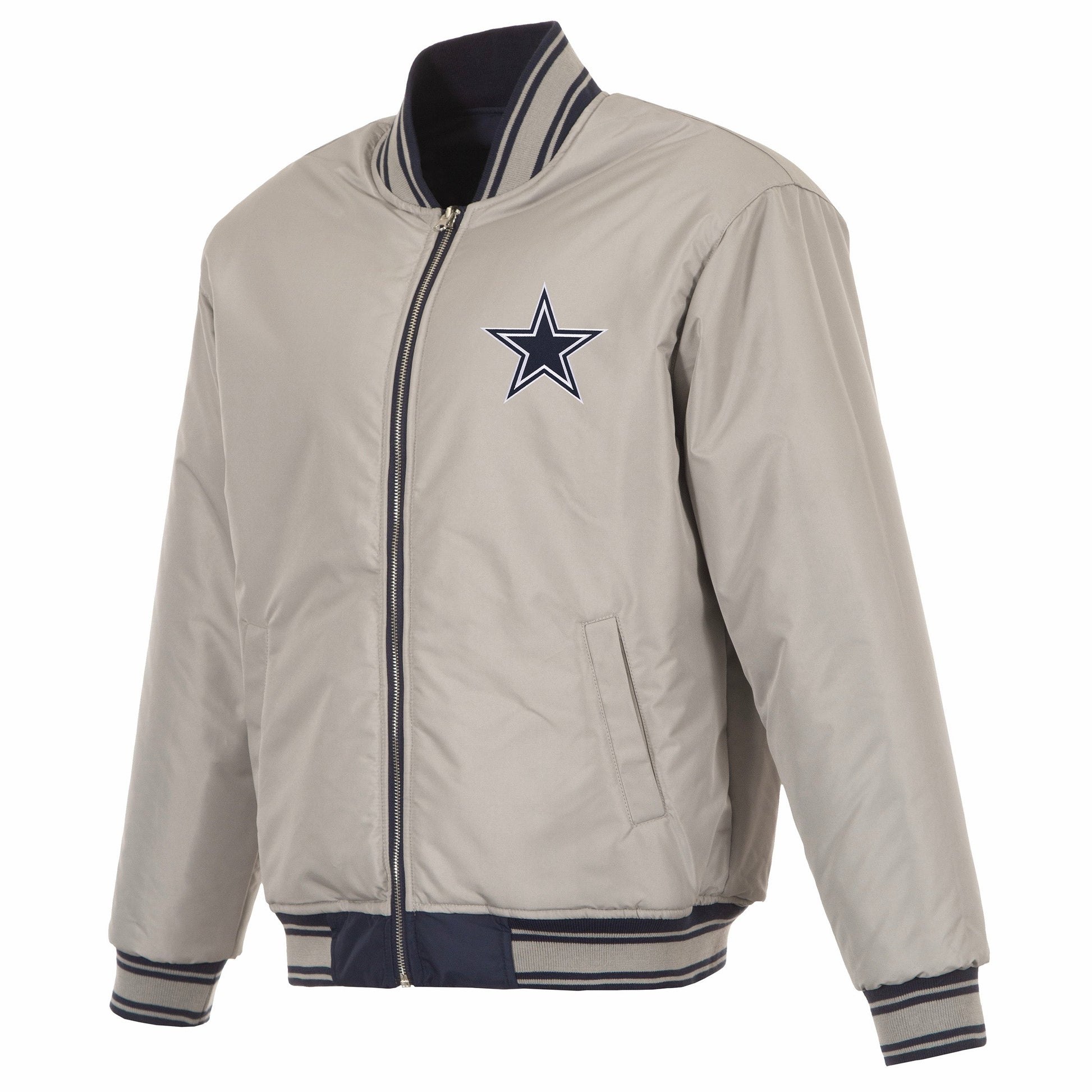 Dallas Cowboys reversible nylon bomber in navy and grey with embroidered logos. Assembled in the USA. 100% Nylon, full length zip front.