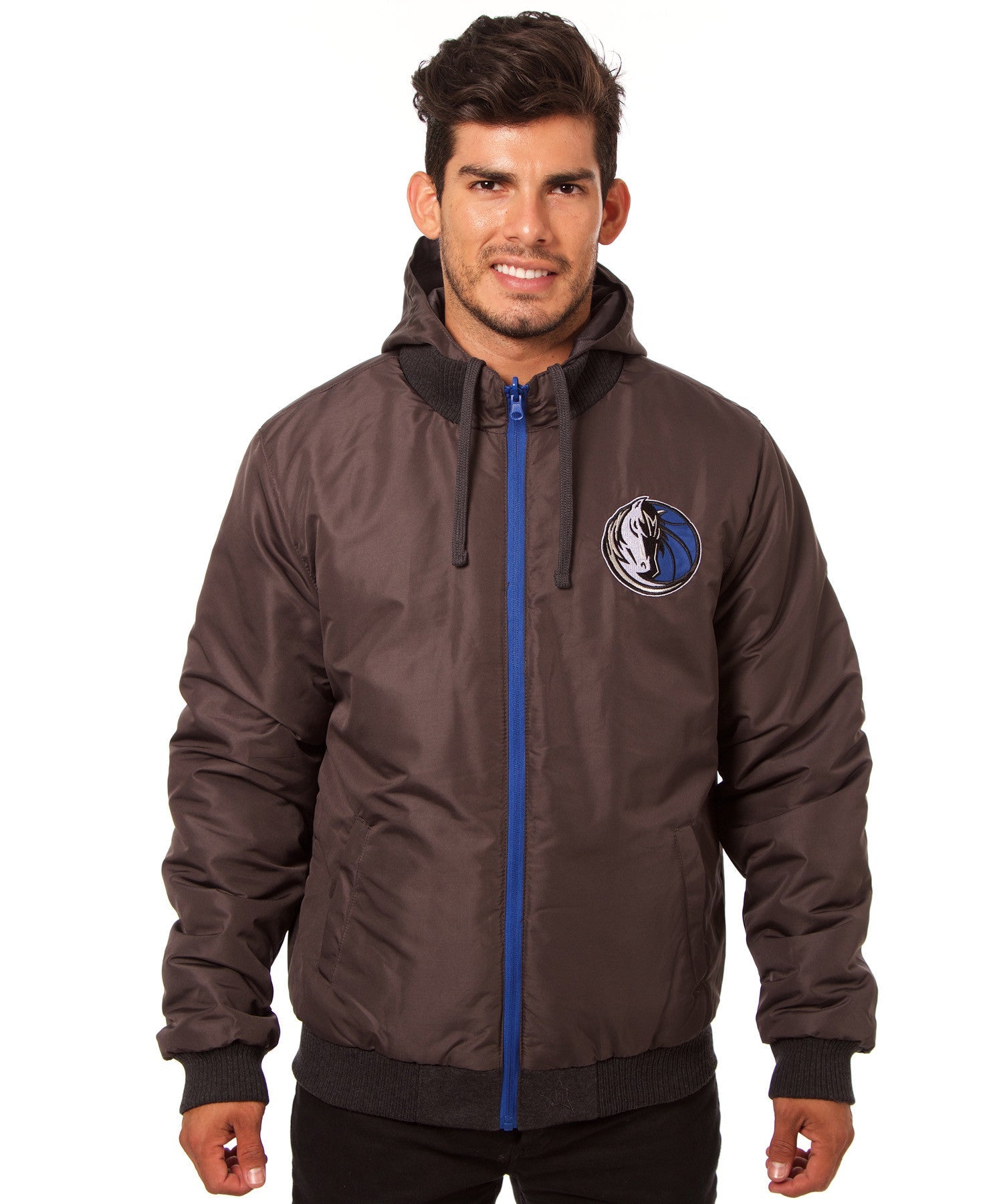 Dallas Mavericks reversible fleece hooded jacket in charcoal with polyester color-blocking and embroidered appliqué logos. Reverse side is nylon.