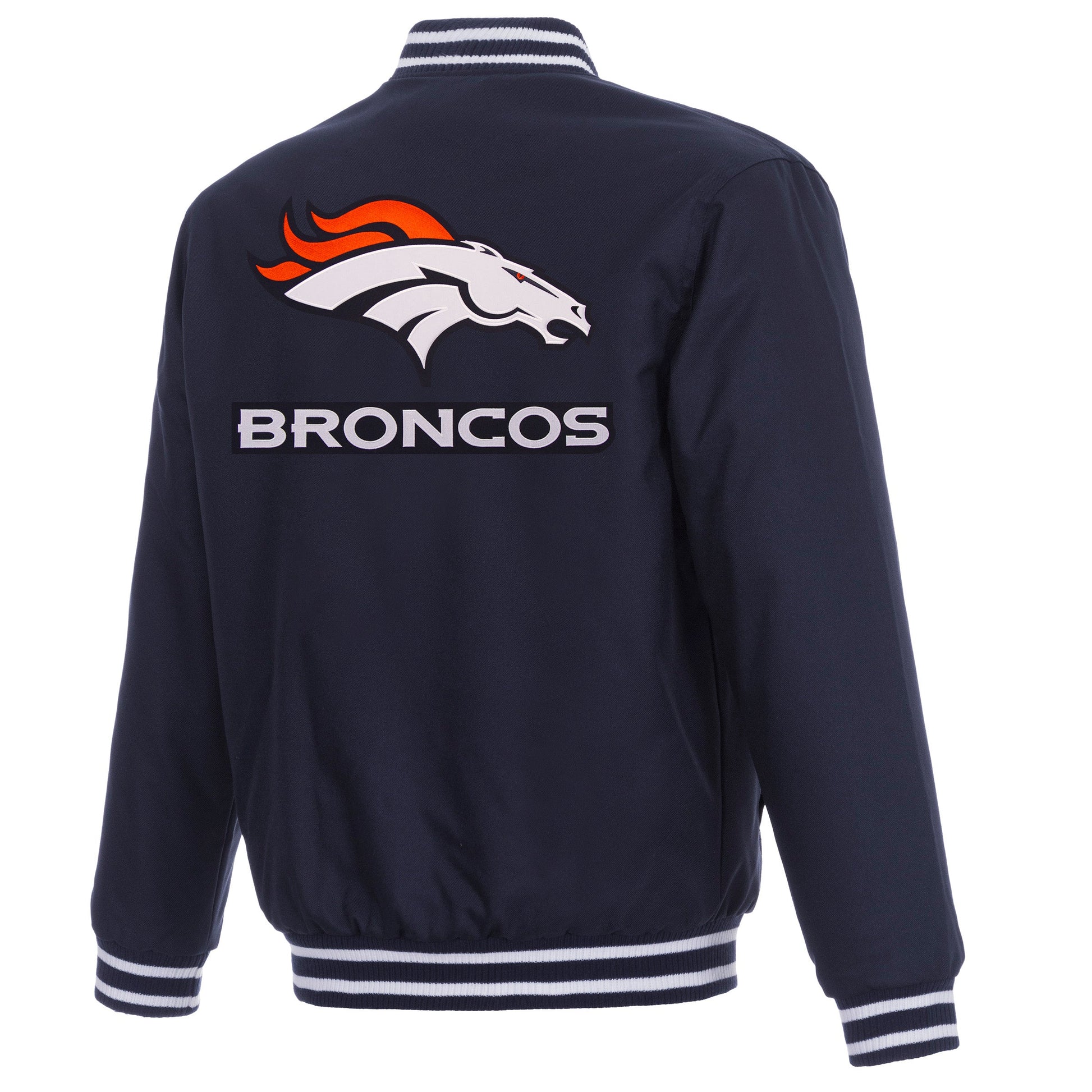 Denver Broncos Poly-Twill Jacket with quilted nylon lining in navy with embroidered logos. Assembled in the USA. 100% polyester body. Snap button closure