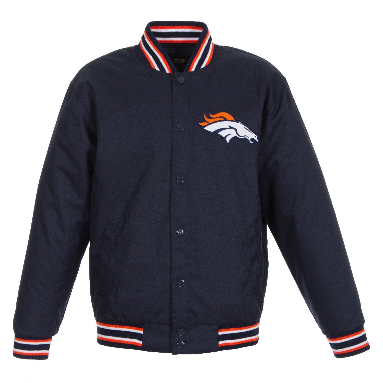 Denver Broncos poly-twill jacket in navy with quilted knit jersey lining and embroidered logos. Imported