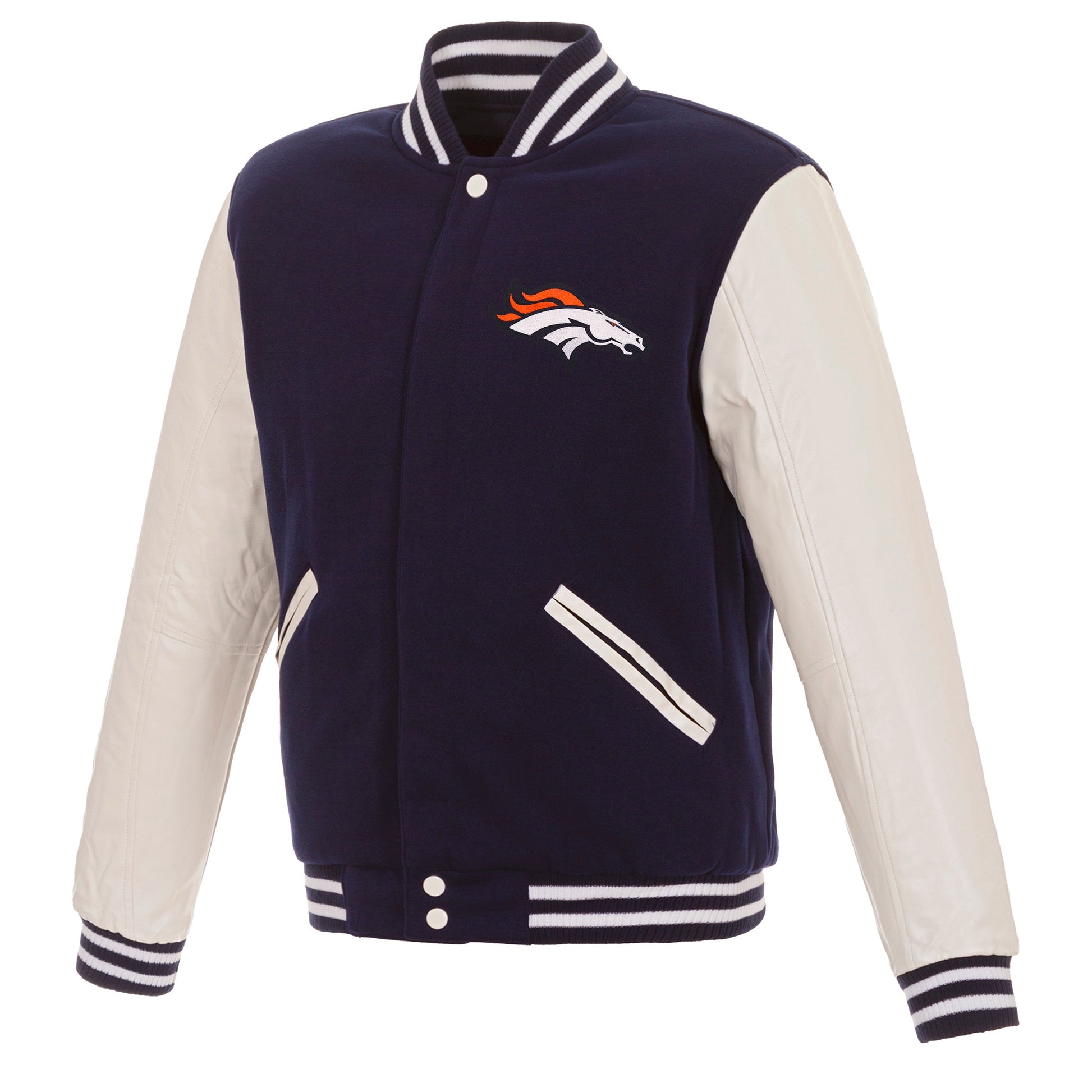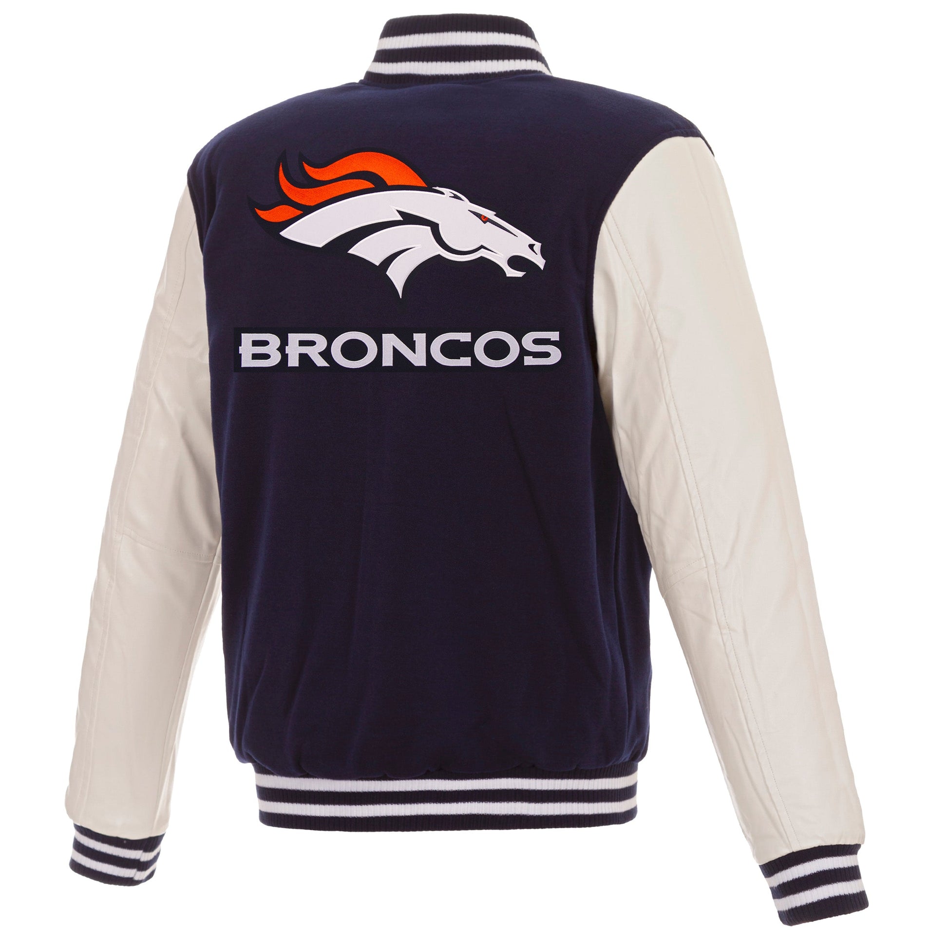 Denver Broncos reversible fleece jacket with faux leather sleeves in navy and white with embroidered logos. Assembled in the USA. 100% polyester body, faux leather sleeves, snap button closure.