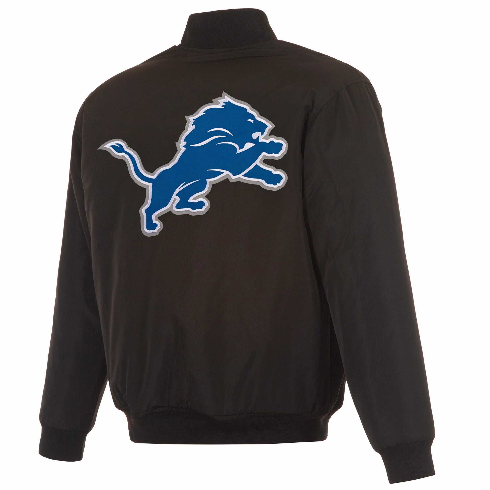 Detroit Lions reversible nylon bomber in black and grey with embroidered logos. Assembled in the USA. 100% Nylon, full length zip front.