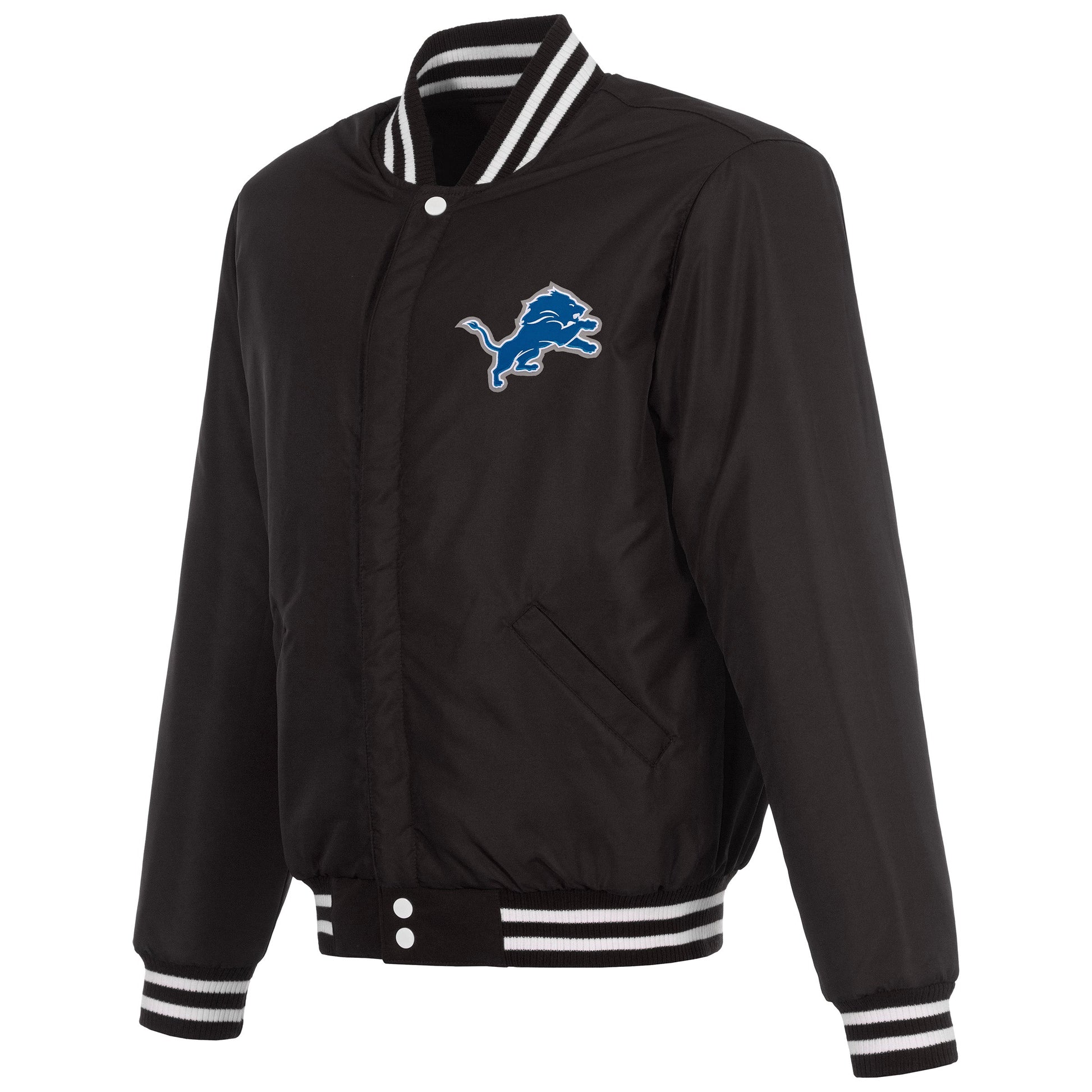 Detroit Lions reversible fleece jacket with faux leather sleeves in black and white with embroidered logos. Assembled in the USA. 100% polyester body, faux leather sleeves, snap button closure.