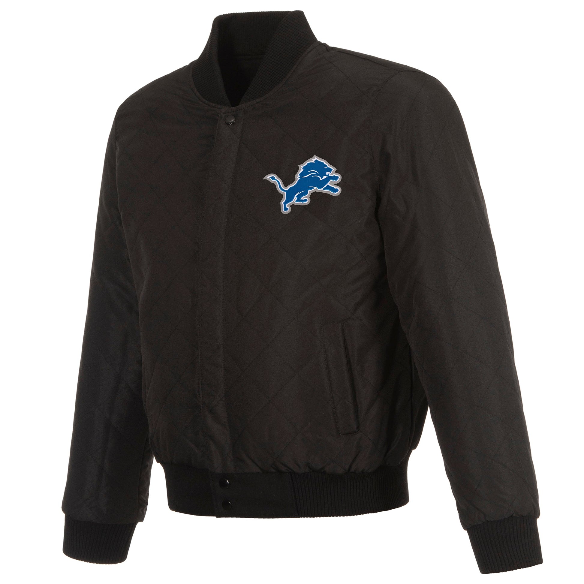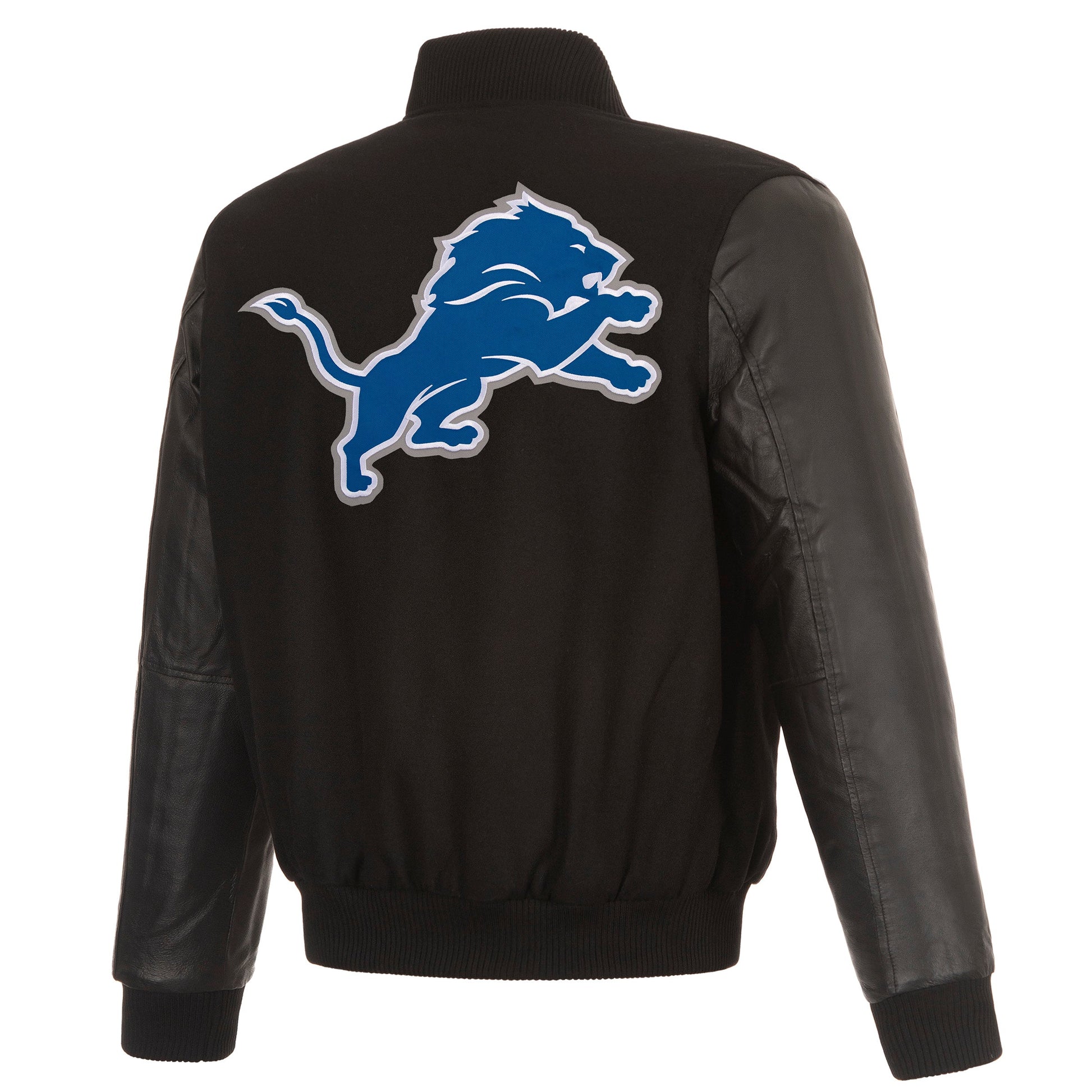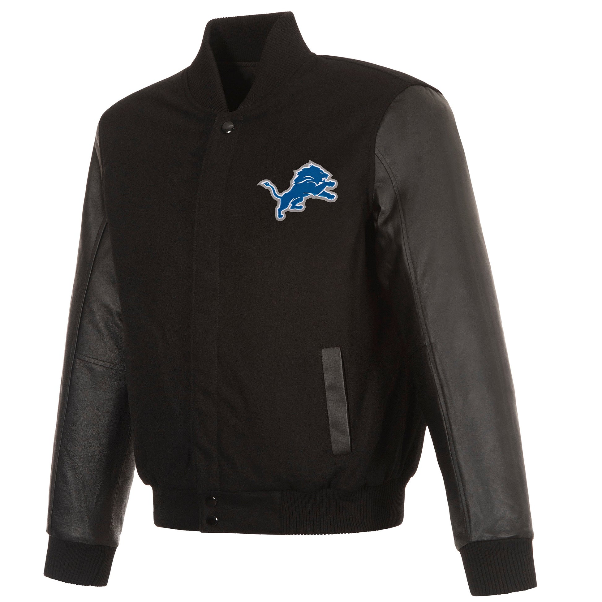 Detroit Lions reversible wool body and leather sleeves jacket in black with quilted lining and embroidered appliqué logos.