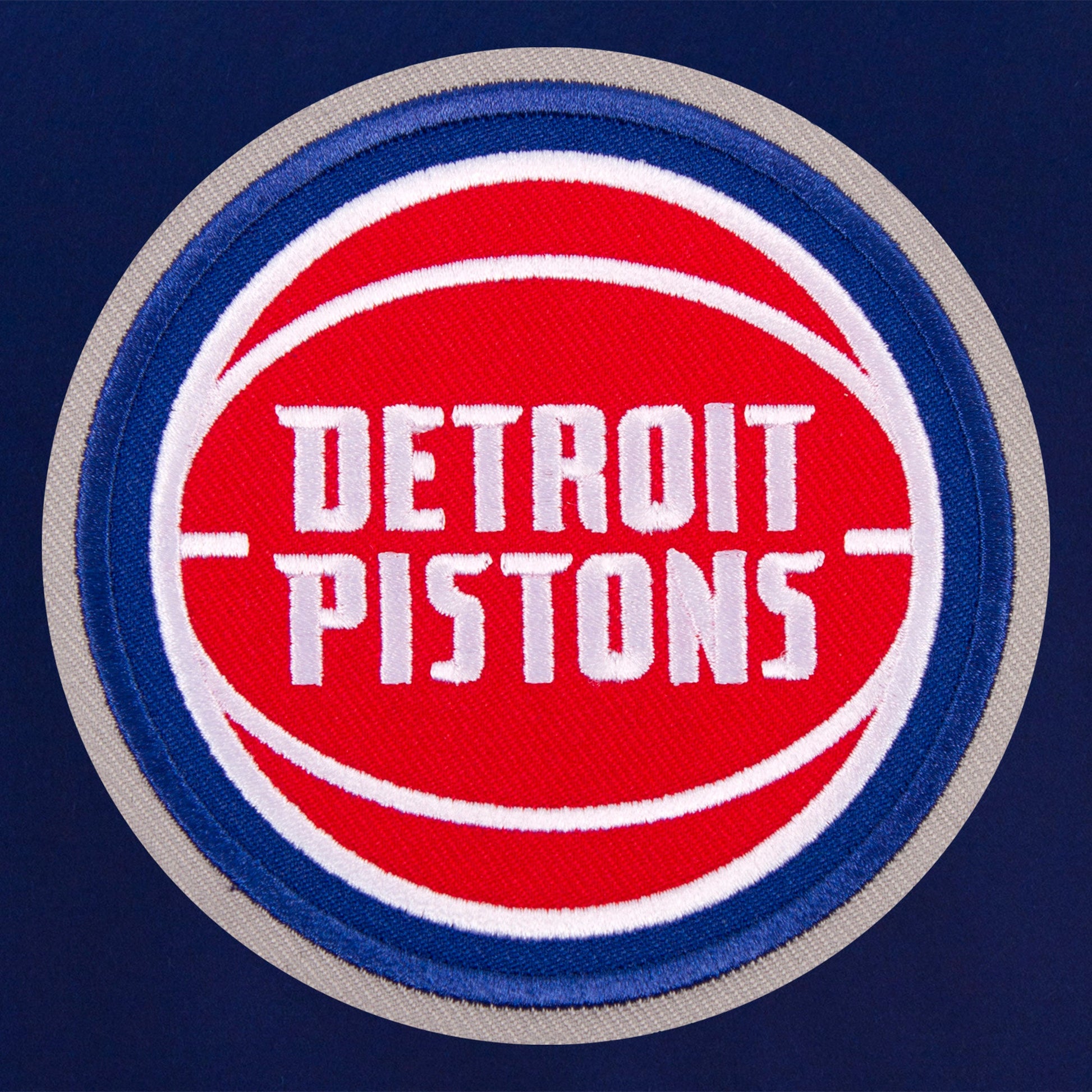 Detroit Pistons All Wool Jacket with nylon lining in royal and white with embroidered logos. Assembled in the USA. 55% wool 45% polyester body. Snap button closure.