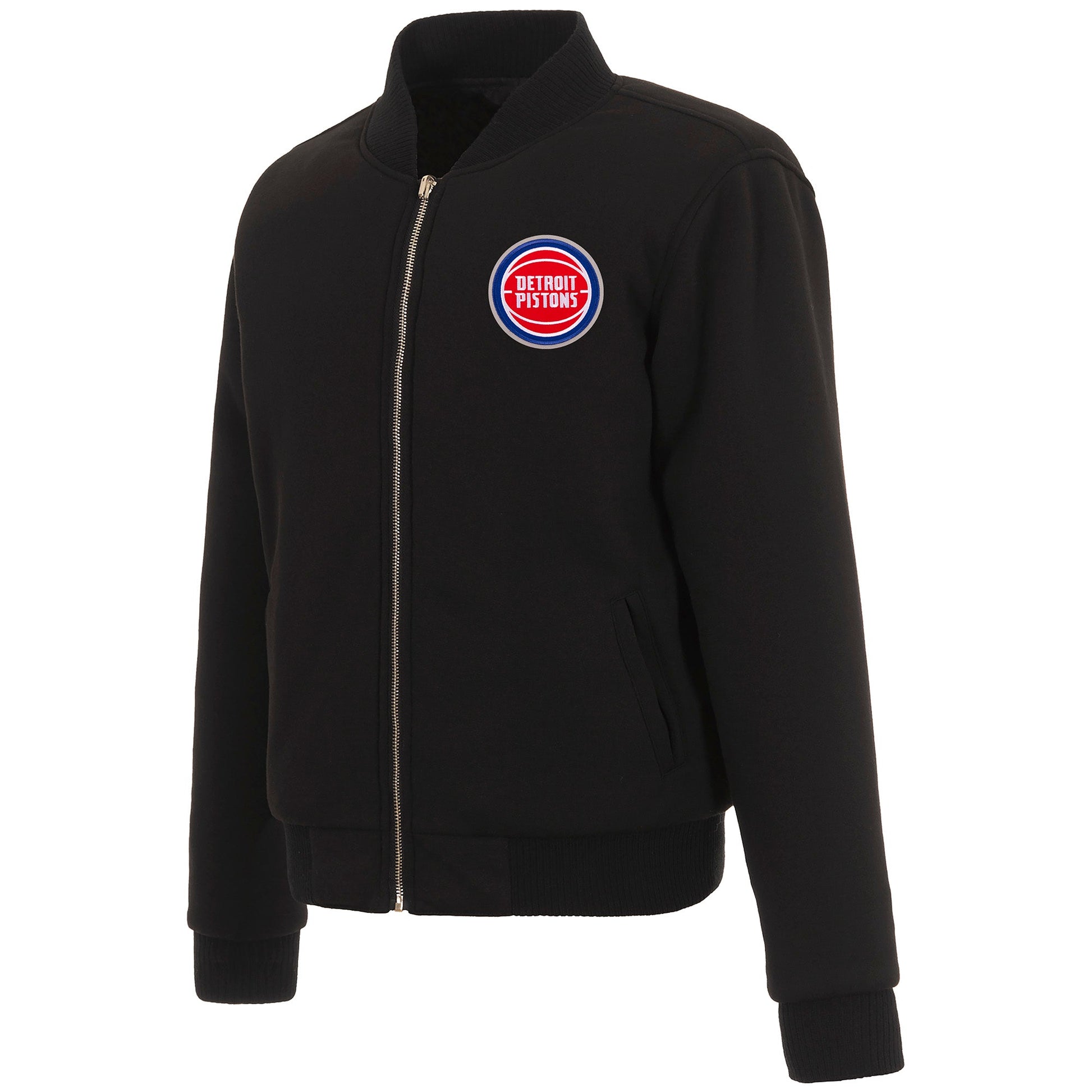 Detroit Pistons Ladies reversible fleece jacket in black with embroidered logos. Assembled in the USA. 100% polyester body, reverse nylon side, metal zip closure.