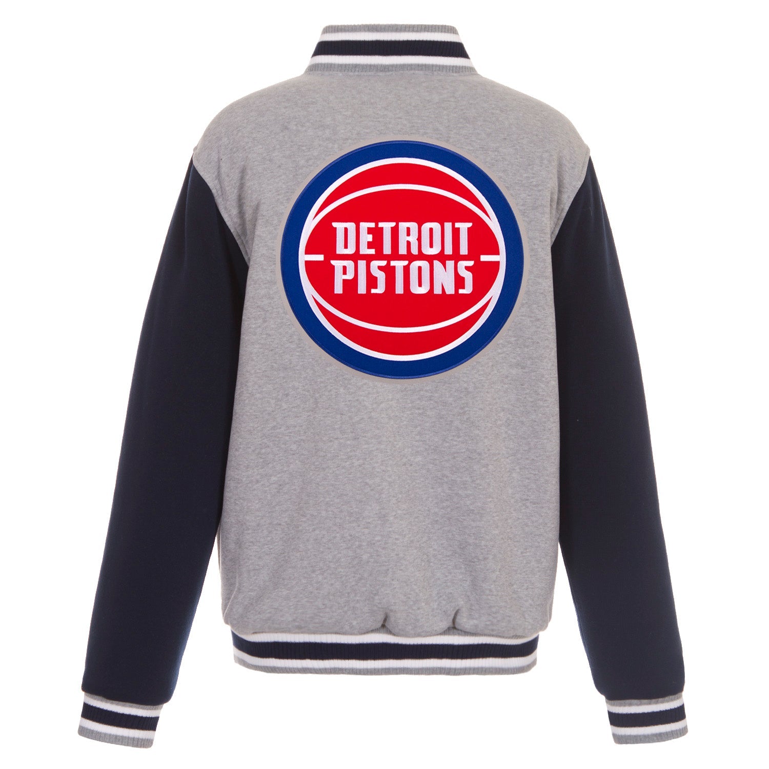 Detroit Pistons reversible two-tone fleece jacket in gray-navy with nylon lining and embroidered logos. (Front and Back Logos)