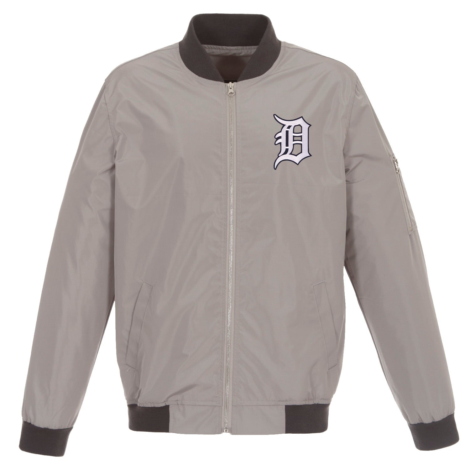 Detroit Tigers nylon bomber in gray-charcoal with embroidered logos.