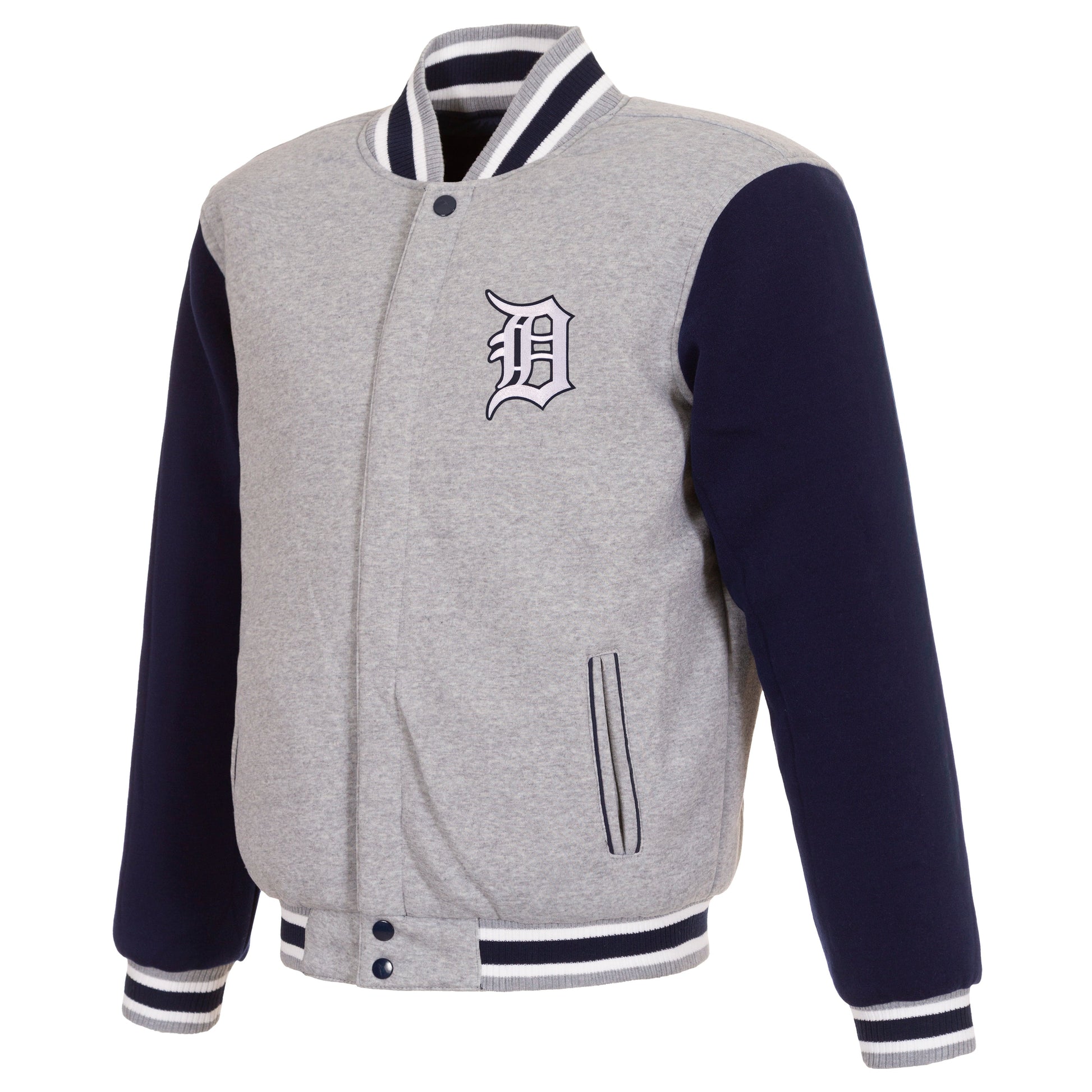Detroit Tigers reversible two-tone fleece jacket in gray and navy with nylon lining and embroidered logos.