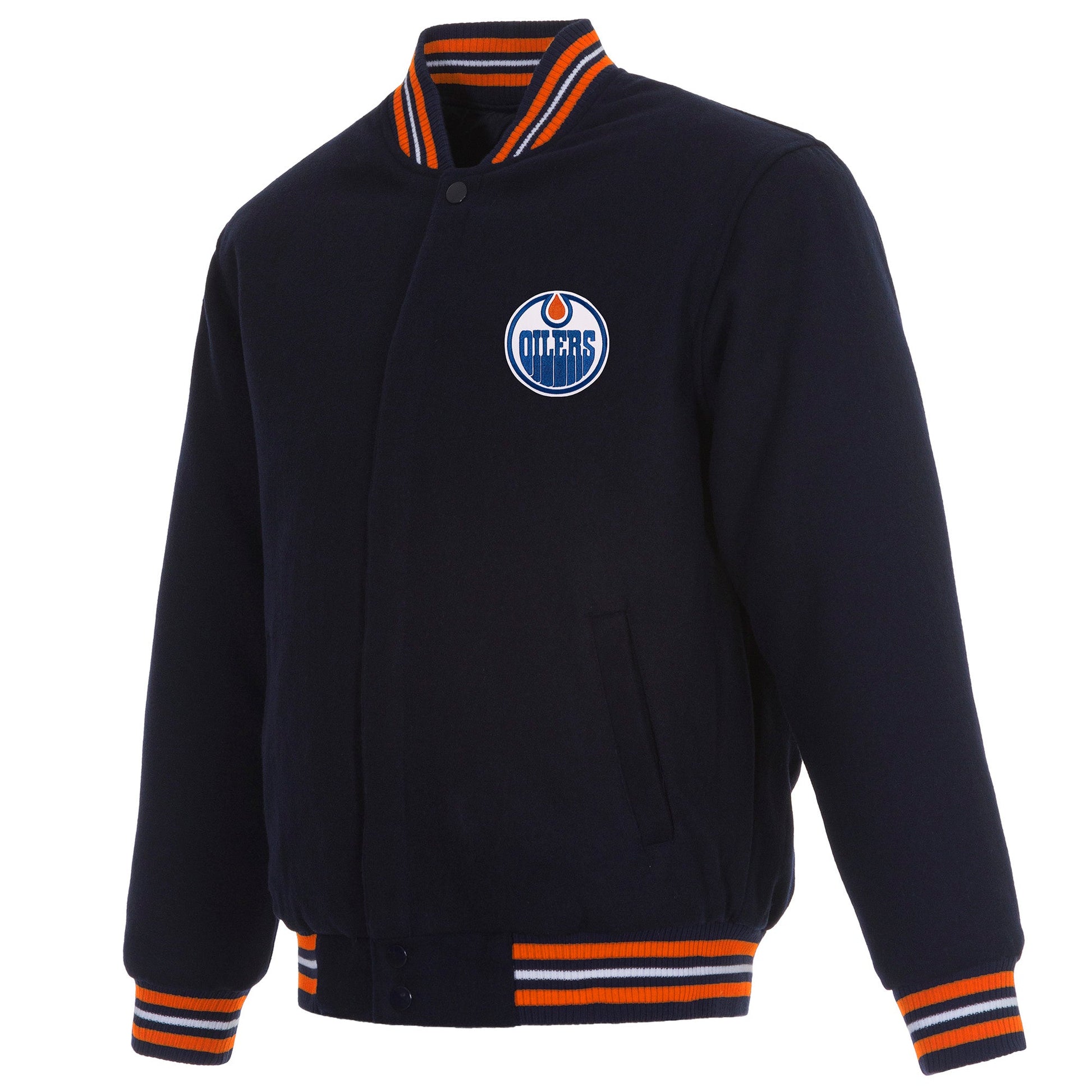 Boston Bruins Poly-Twill Jacket with nylon lining in navy orange with embroidered logos. Assembled in the USA. 55% wool 45% polyester body. Snap button closure.