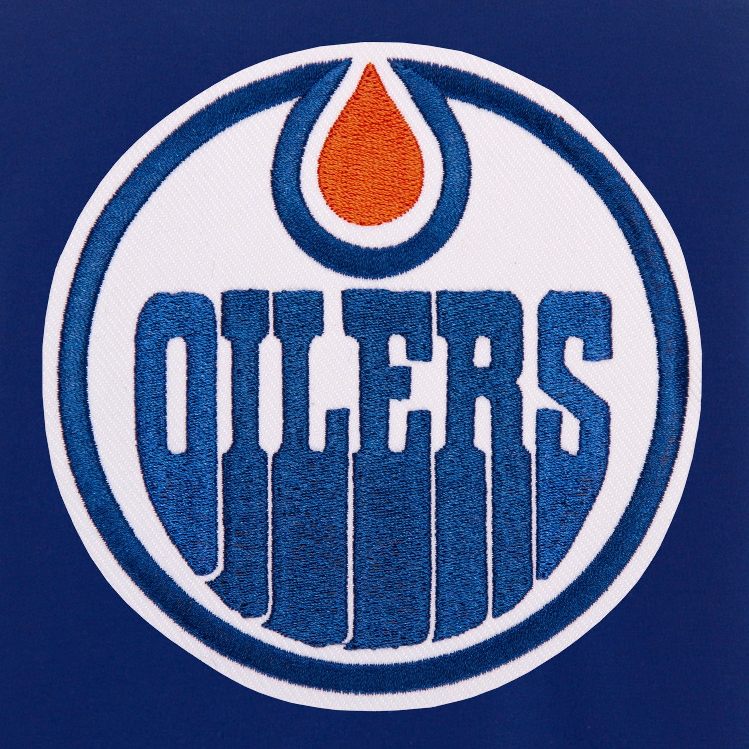 Edmonton Oilers reversible fleece jacket with faux leather sleeves in royal and white with embroidered logos. Assembled in the USA. 100% Polyester body, faux leather sleeves, snap button closure.