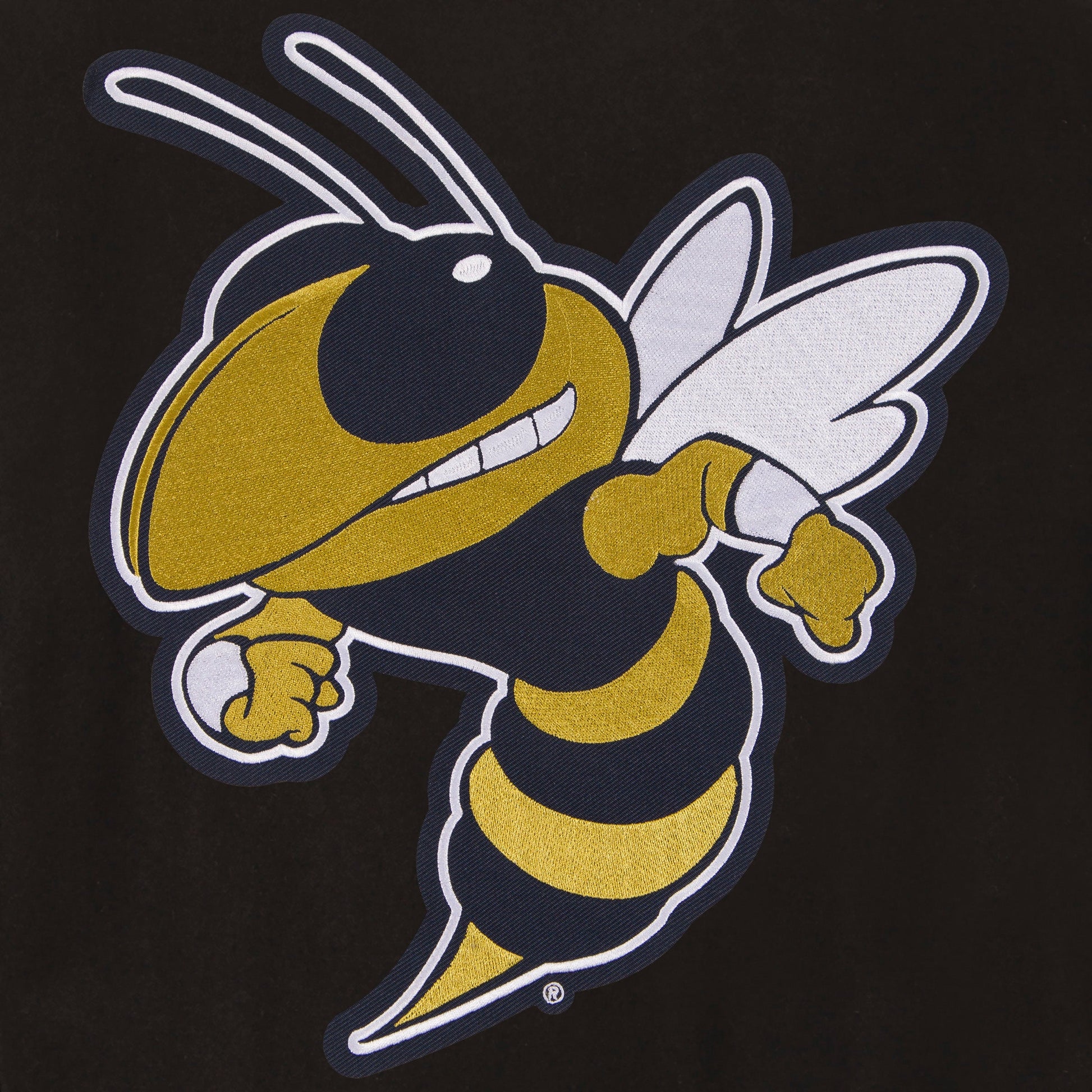 Georgia Tech Reversible Wool and Leather Jacket with quilted nylon lining in black with embroidered logos. Assembled in the USA. 55% Wool 45% polyester body, 100% leather sleeves. Snap button closure.