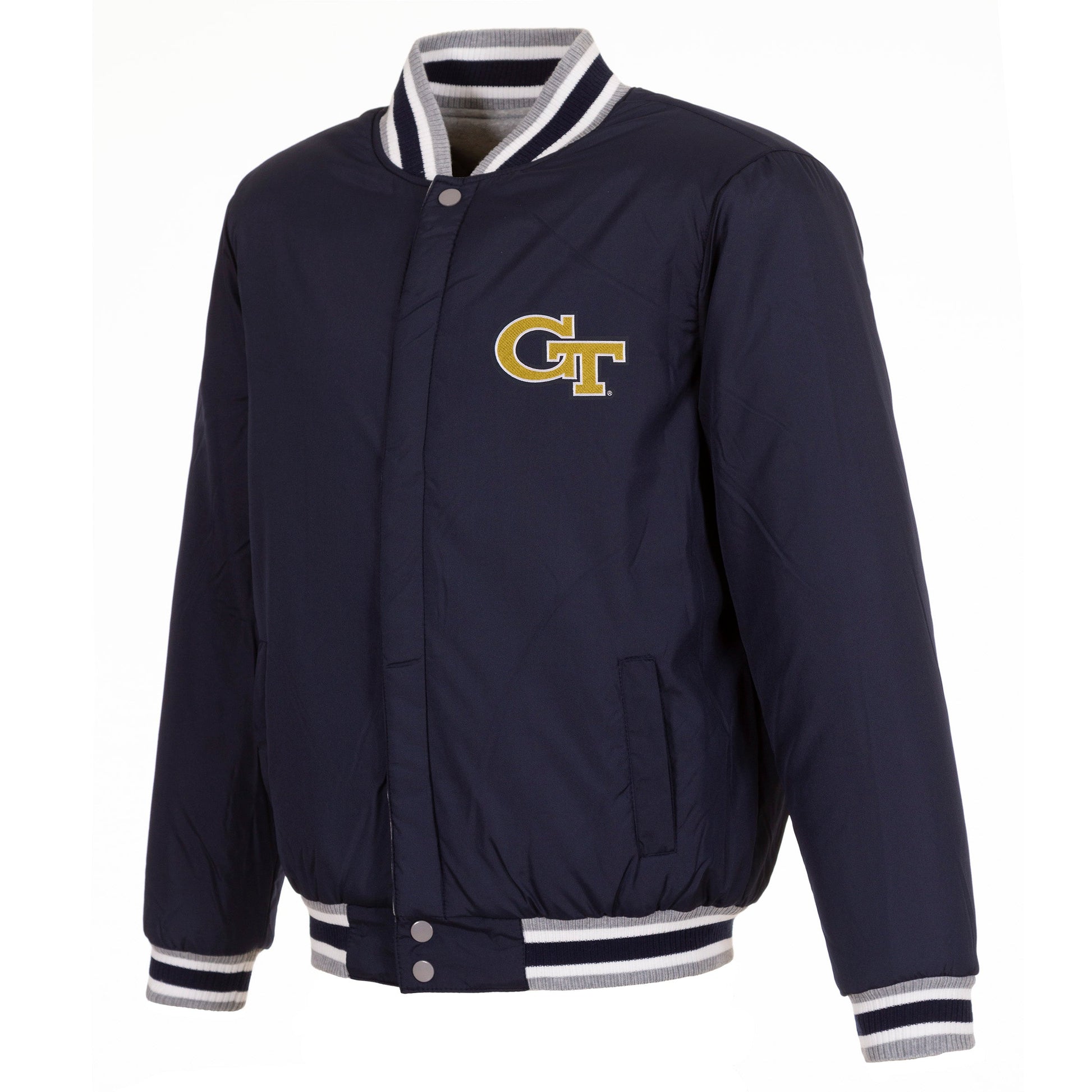 Georgia Tech reversible two-tone fleece jacket in grey and navy with embroidered logos. Assembled in the USA. 100% polyester body, reverse nylon side, snap button closure.