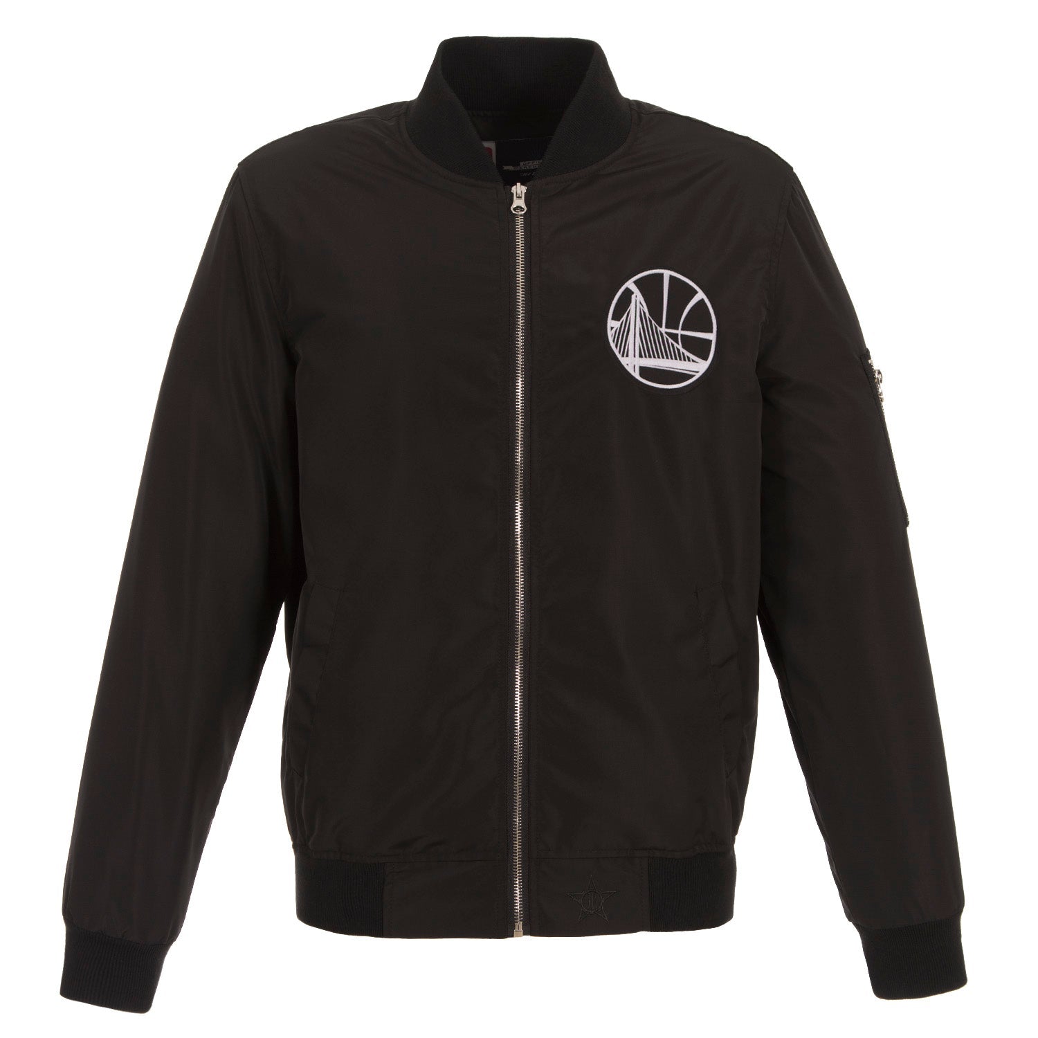 Golden State Warriors nylon bomber in gray-charcoal with embroidered logos.