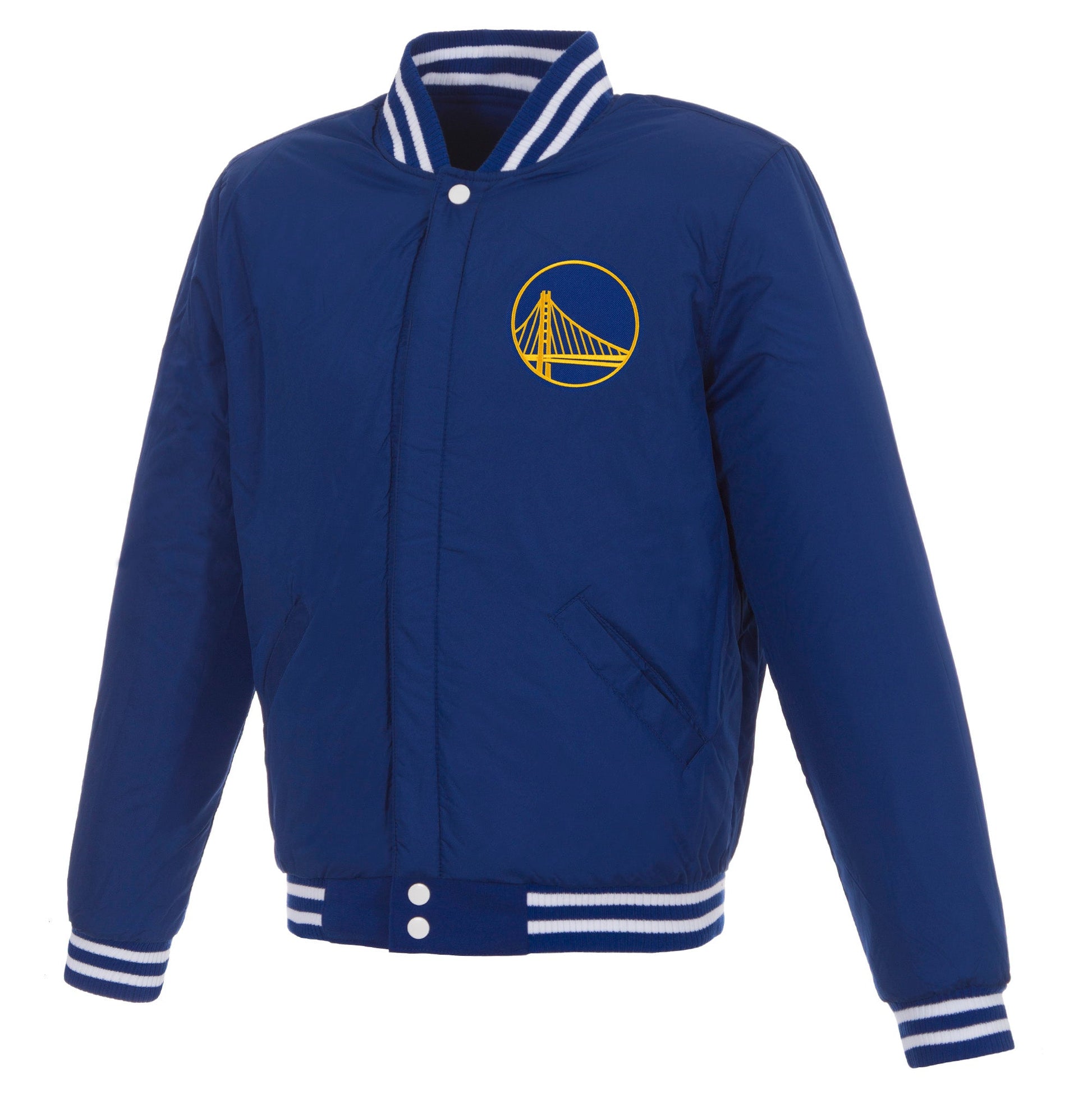 Golden State Warriors reversible fleece jacket with faux leather sleeves in royal-white with nylon lining and embroidered logos. (Front and Back Logos)