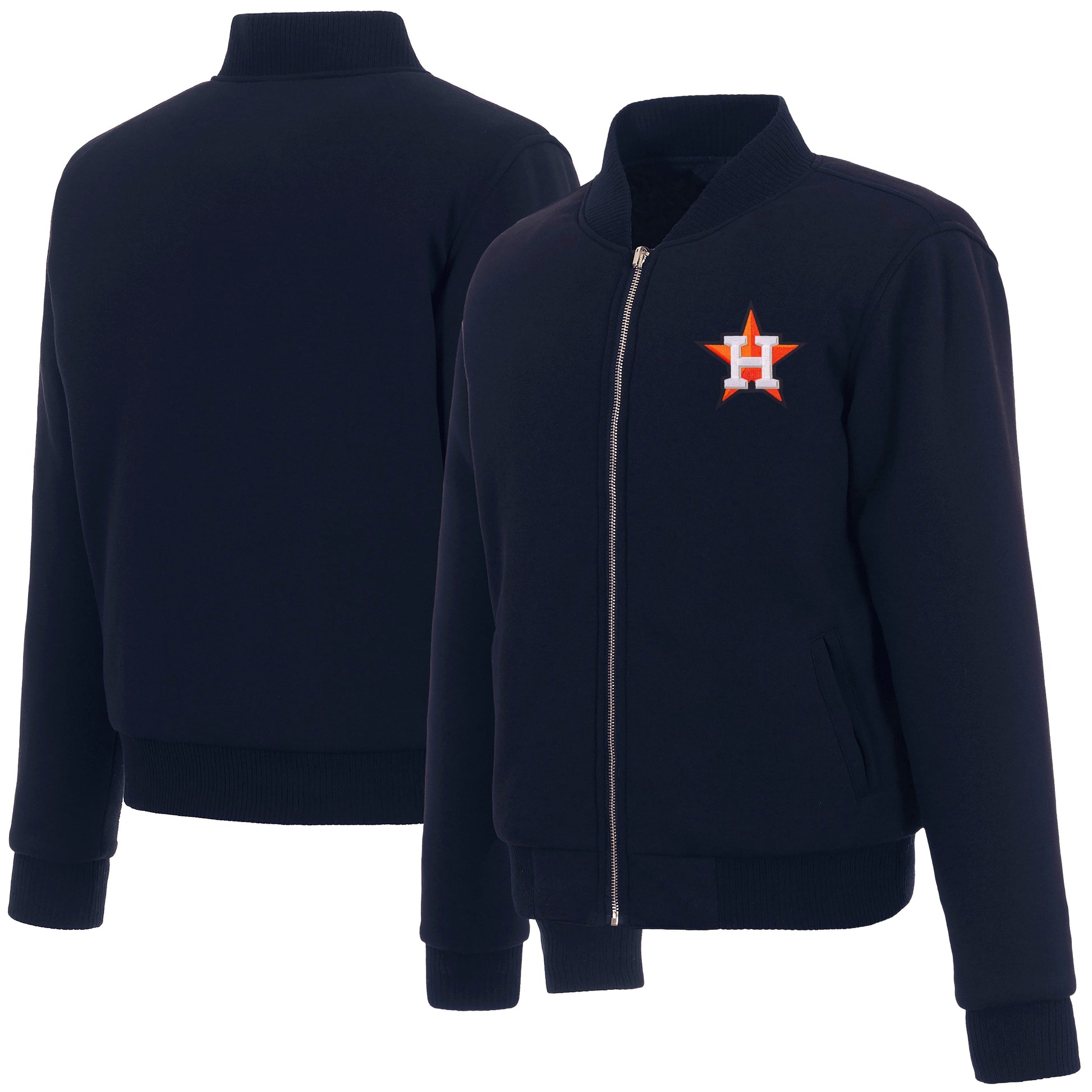 Houston Astros Ladies reversible fleece jacket in navy with embroidered logos. Assembled in the USA. 100% polyester body, reverse nylon side, metal zip closure.