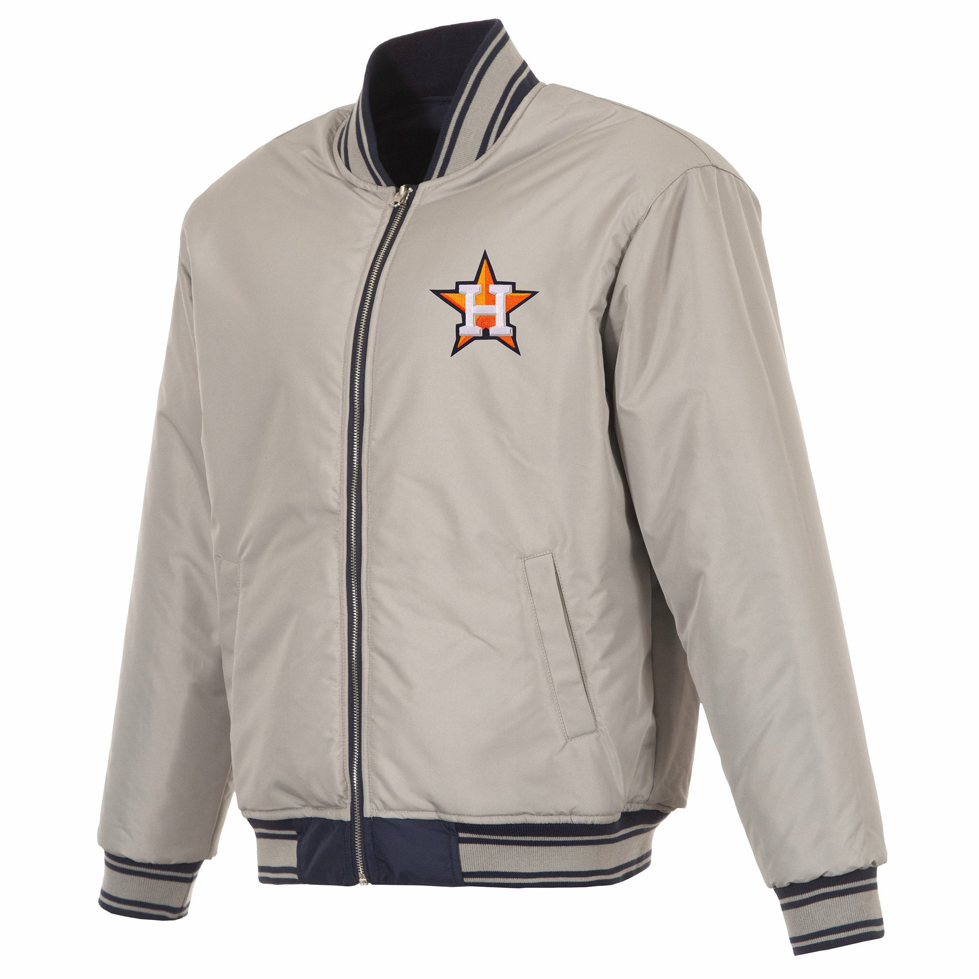 Houston Astros reversible nylon bomber in navy and grey with embroidered logos. Assembled in the USA. 100% Nylon, full length zip front.