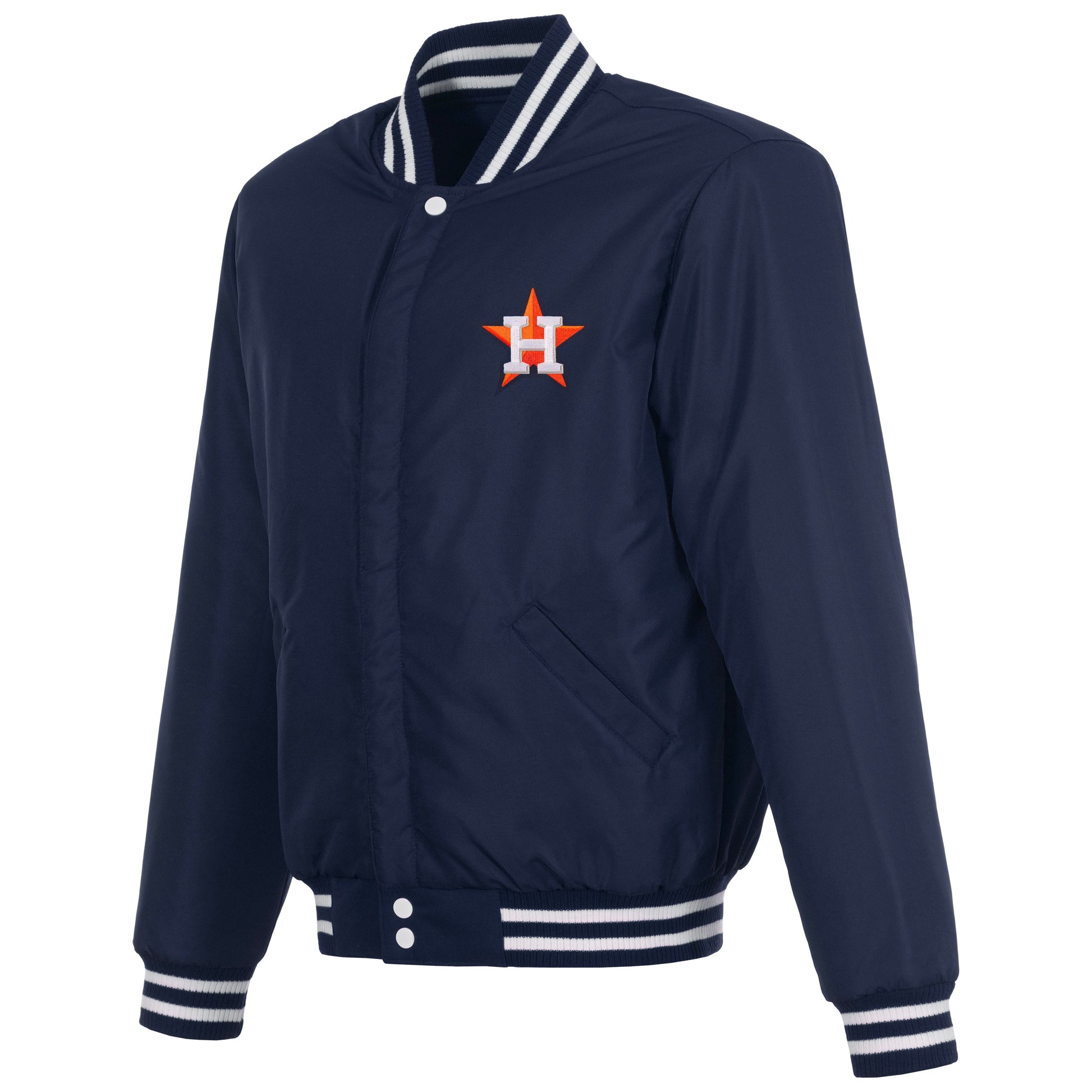 Houston Astros reversible fleece jacket with faux leather sleeves in navy and white with nylon lining and embroidered logos.