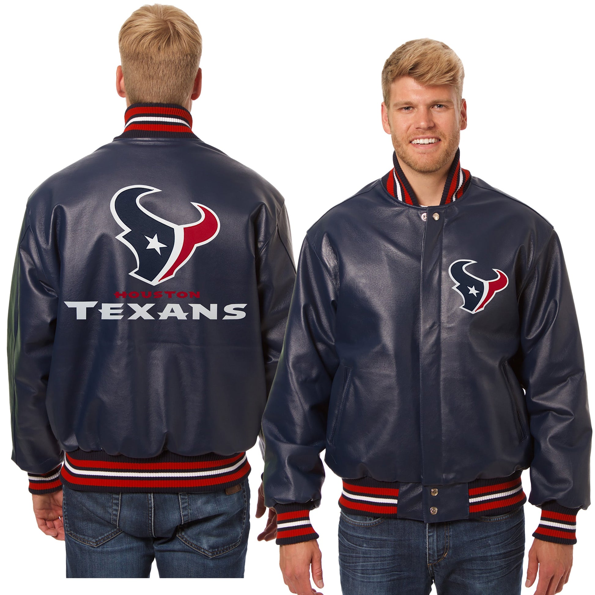 Houston Texans full leather varsity jacket in navy. Made in the USA. 100% leather body and sleeves with quilted nylon lining and leather logos, traditional snap front closure.