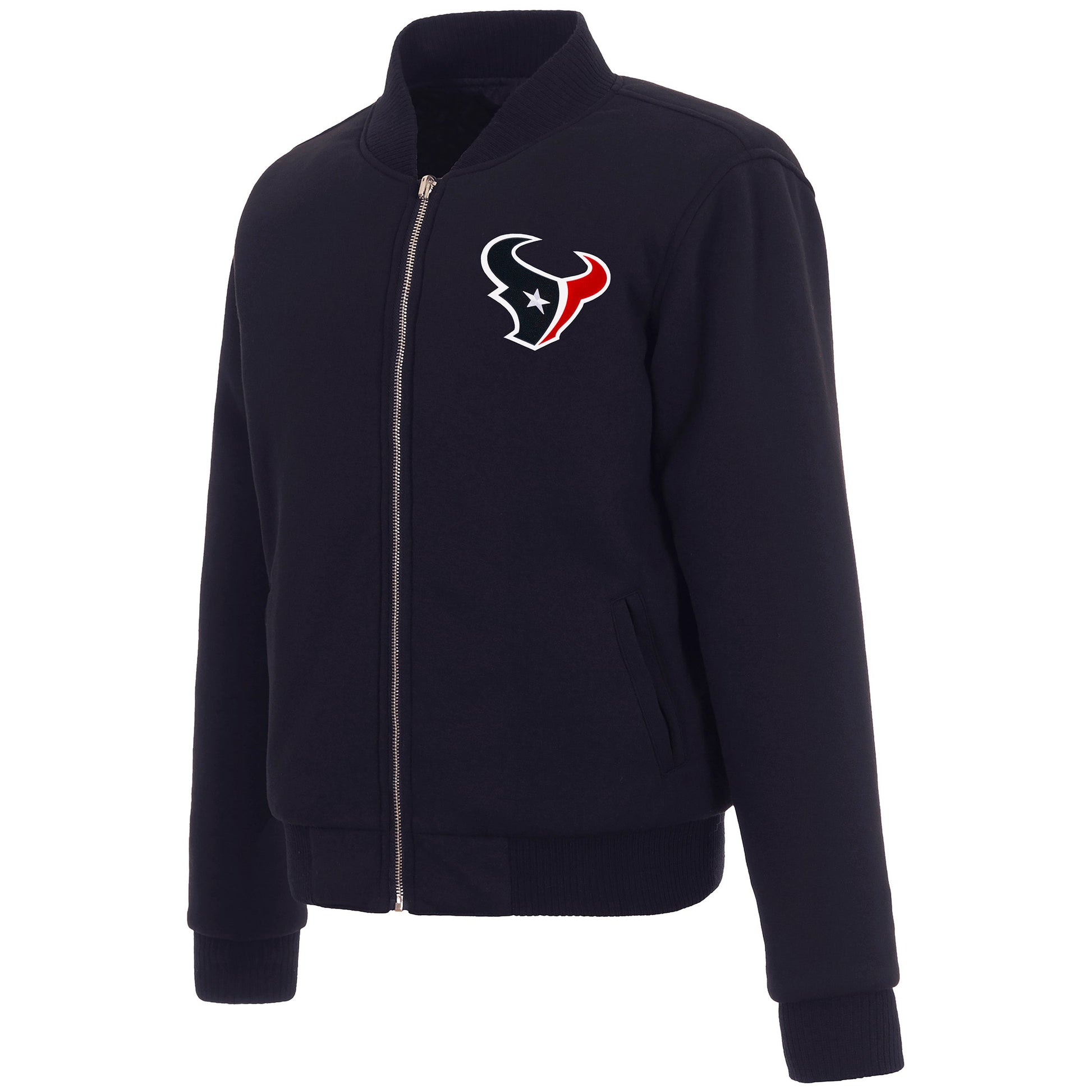 Houston Texans Ladies reversible fleece jacket in black with embroidered logos. Assembled in the USA. 100% polyester body, reverse nylon side, metal zip closure.