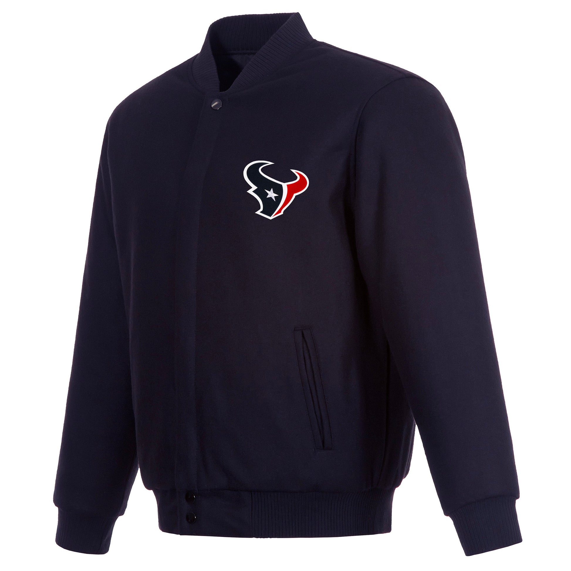 Houston Texans All Wool Jacket with nylon lining in navy and red with embroidered logos. Assembled in the USA. 55% wool 45% polyester body. Snap button closure.