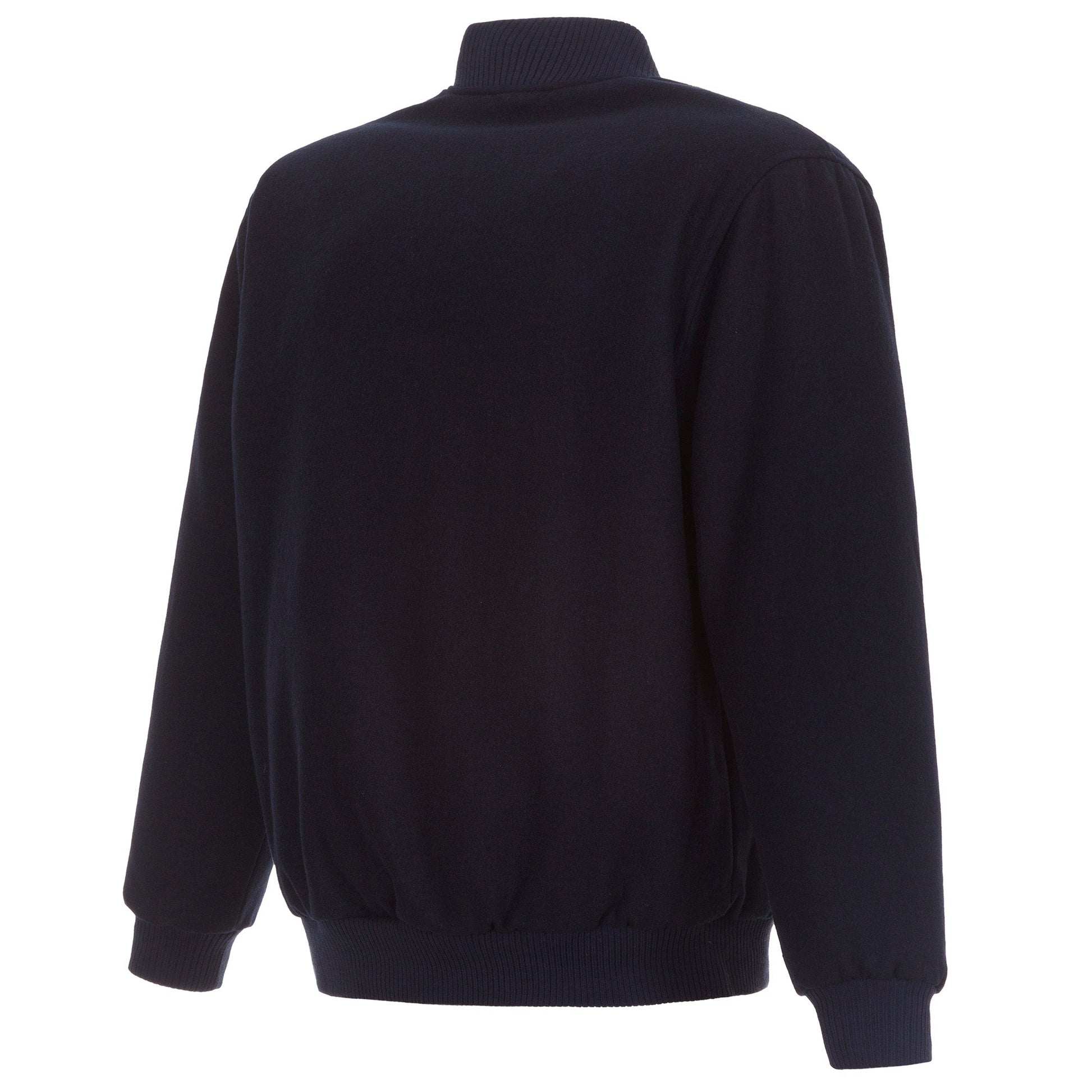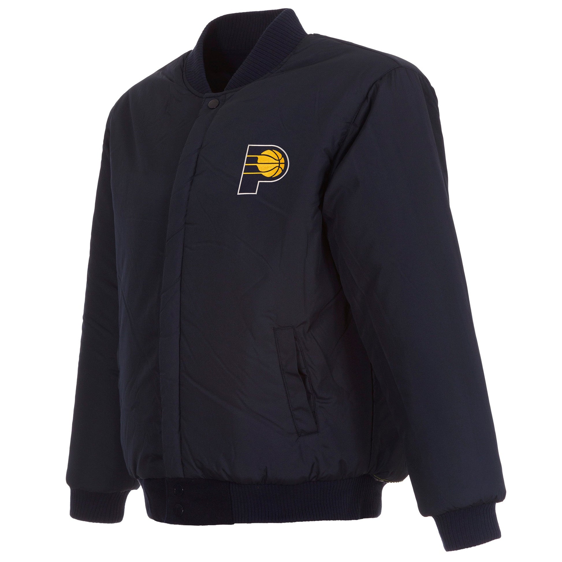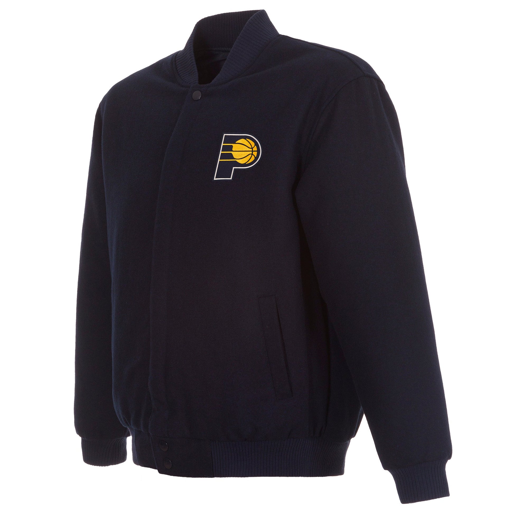 Indiana Pacers All Wool Jacket with nylon lining in navy with embroidered logos. Assembled in the USA. 55% wool 45% polyester body. Snap button closure.