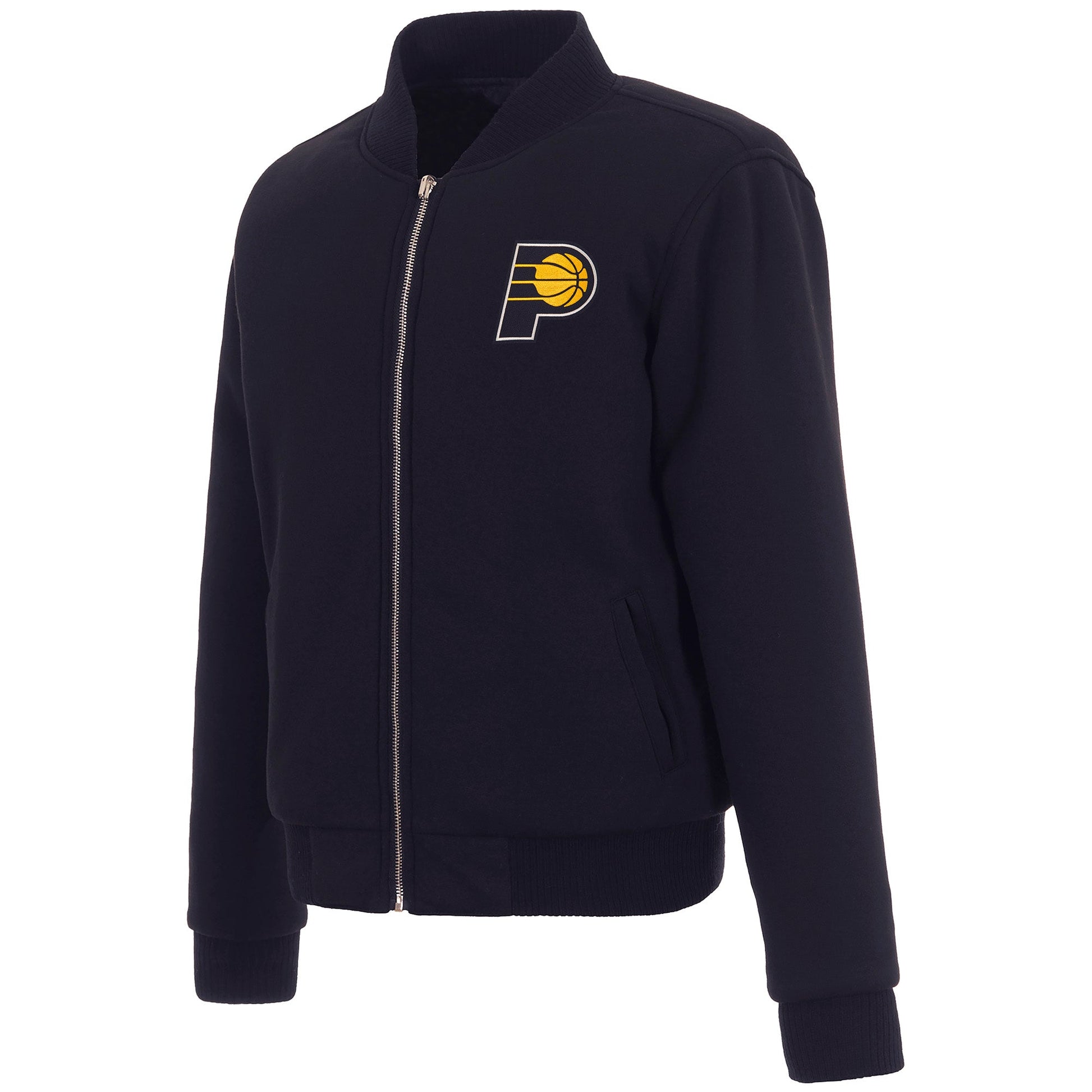 Indiana Pacers Ladies reversible fleece jacket in navy with embroidered logos. Assembled in the USA. 100% polyester body, reverse nylon side, metal zip closure.