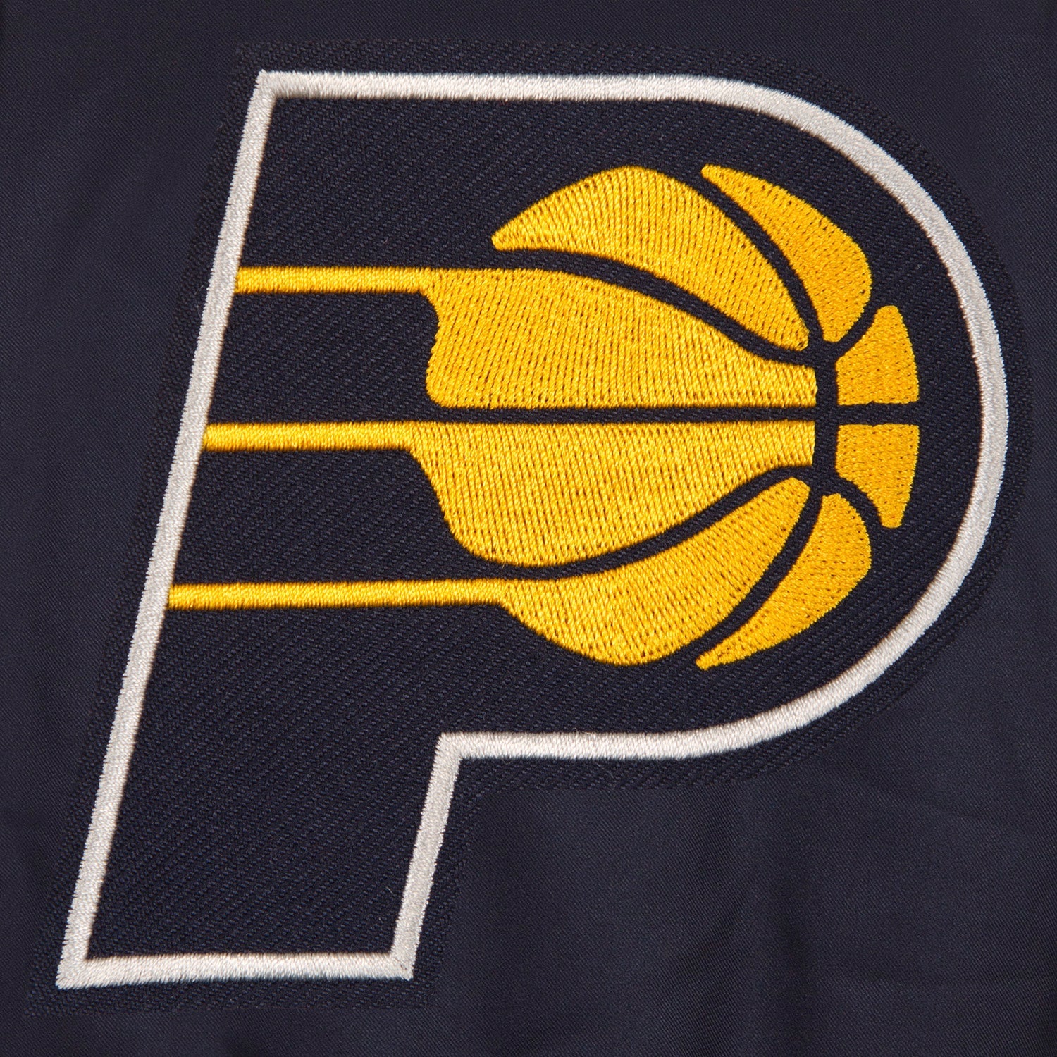Indiana Pacers Poly-Twill Jacket with nylon lining in navy with embroidered logos. Assembled in the USA. 100% Polyester body. Snap button closure.