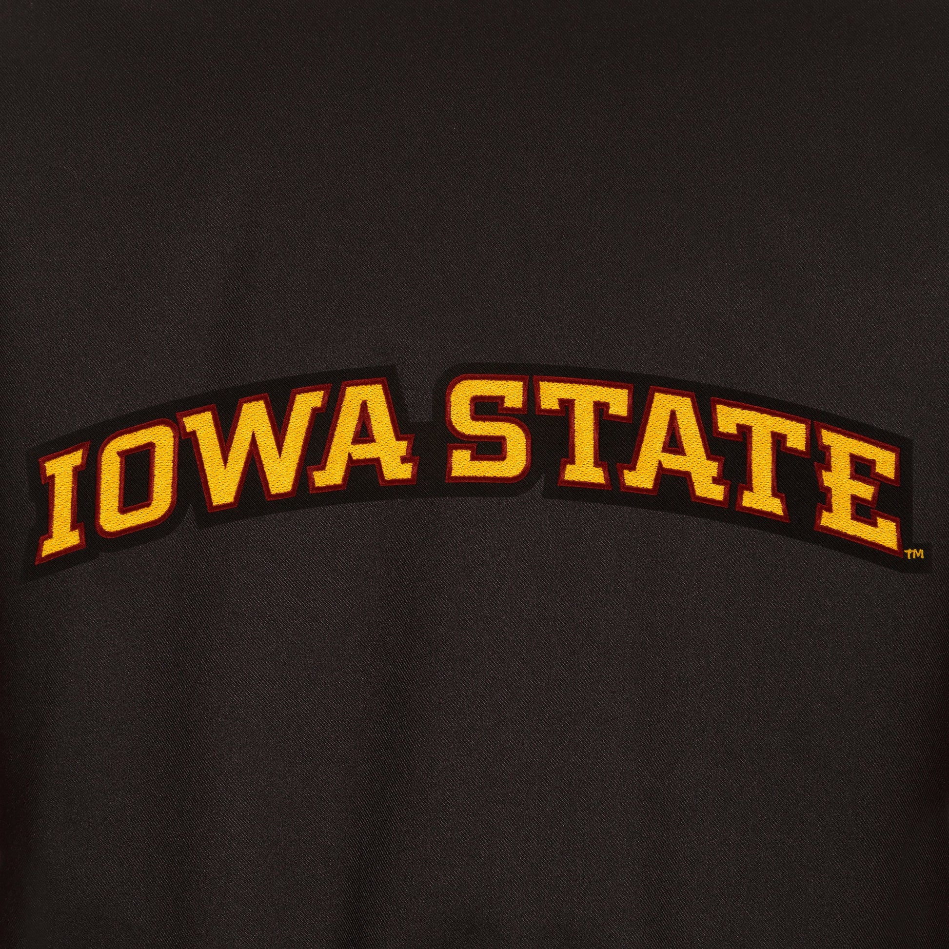 Iowa State University Poly-Twill Jacket with quilted nylon lining in black with embroidered logos. Assembled in the USA. 100% polyester body. Snap button closure.