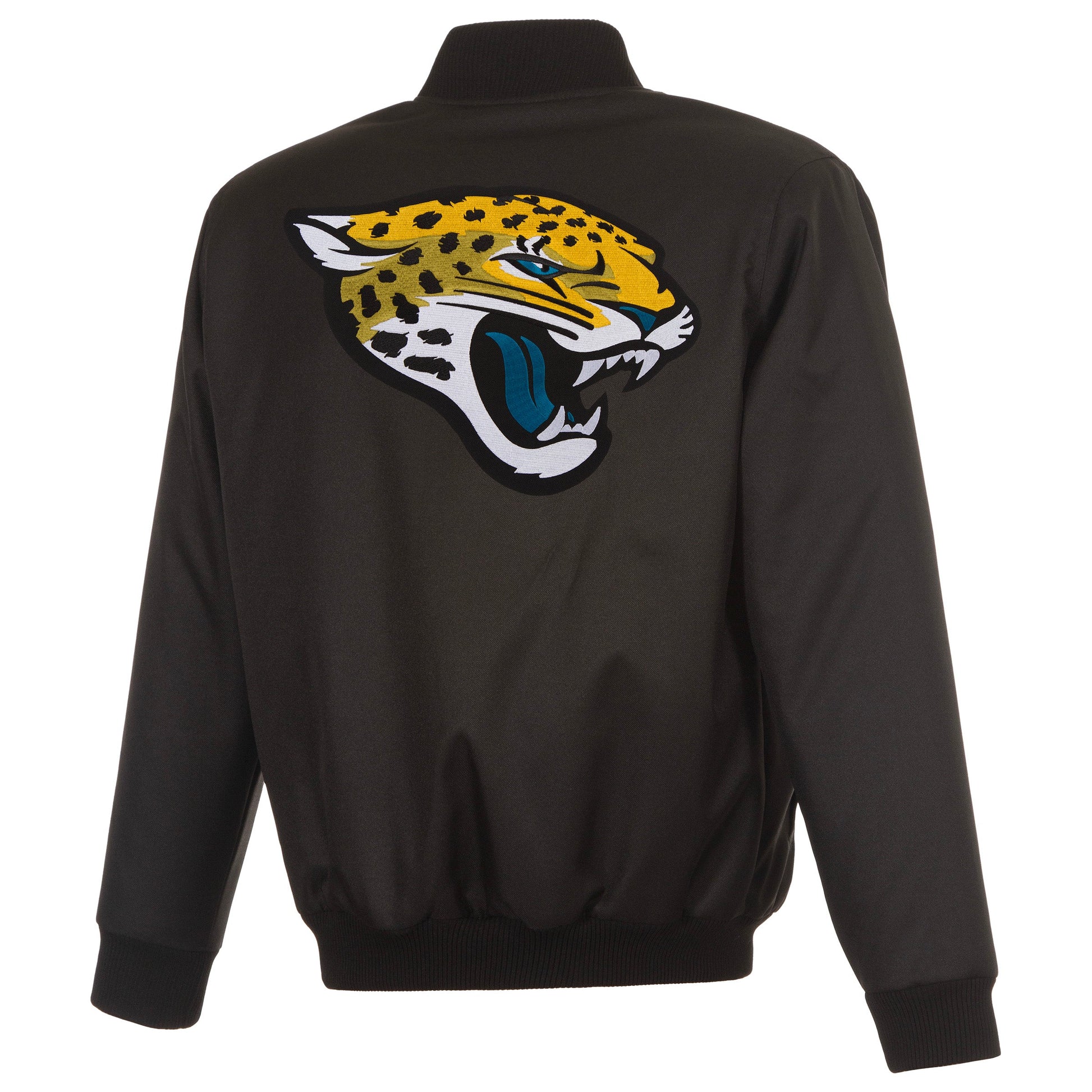 Jacksonville Jaguars Poly-Twill Jacket with quilted nylon lining in black with embroidered logos. Assembled in the USA. 100% Polyester body. Snap button closure.