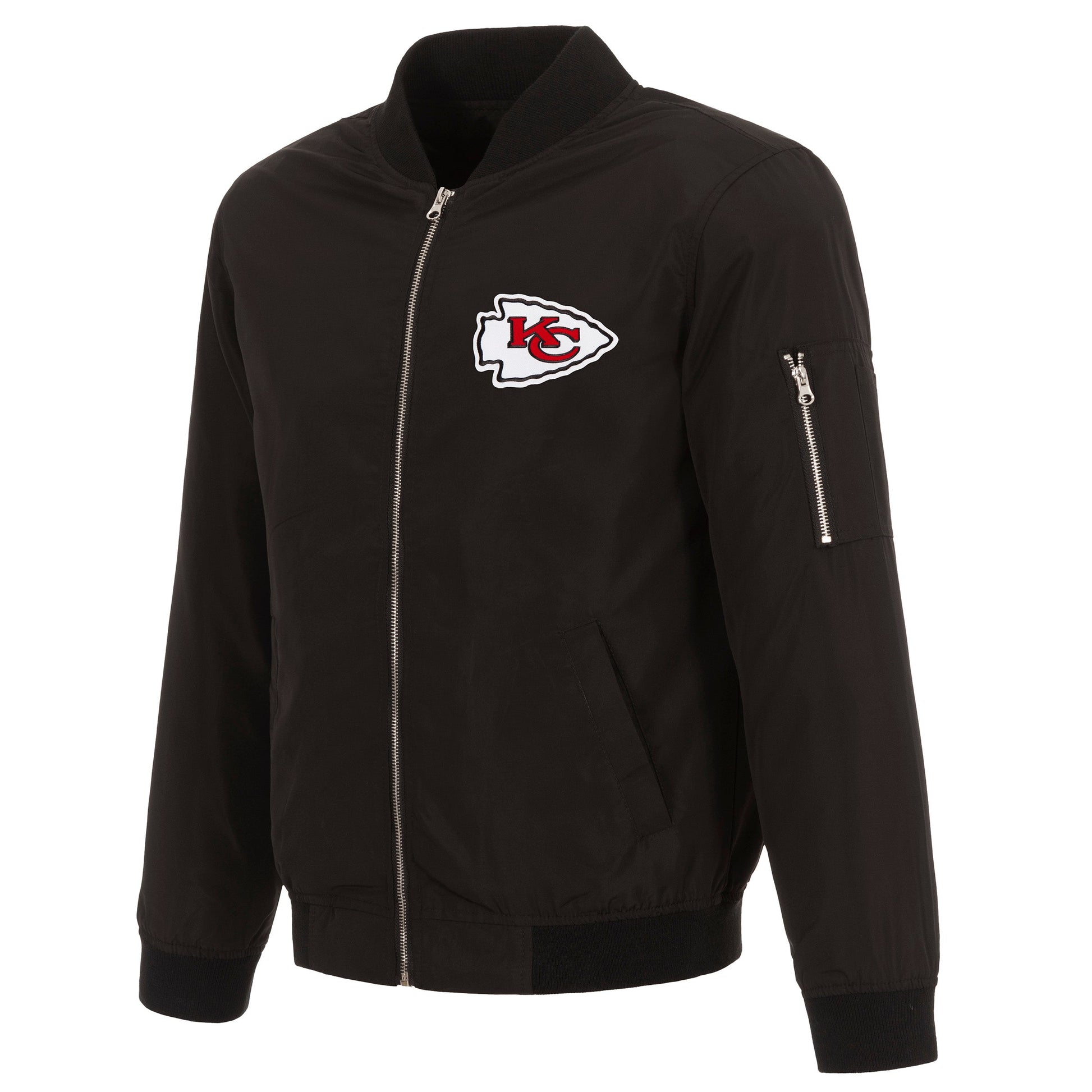 Kansas City Chiefs nylon bomber in black with embroidered logos. Assembled in the USA. 100% Nylon, full length zip front.