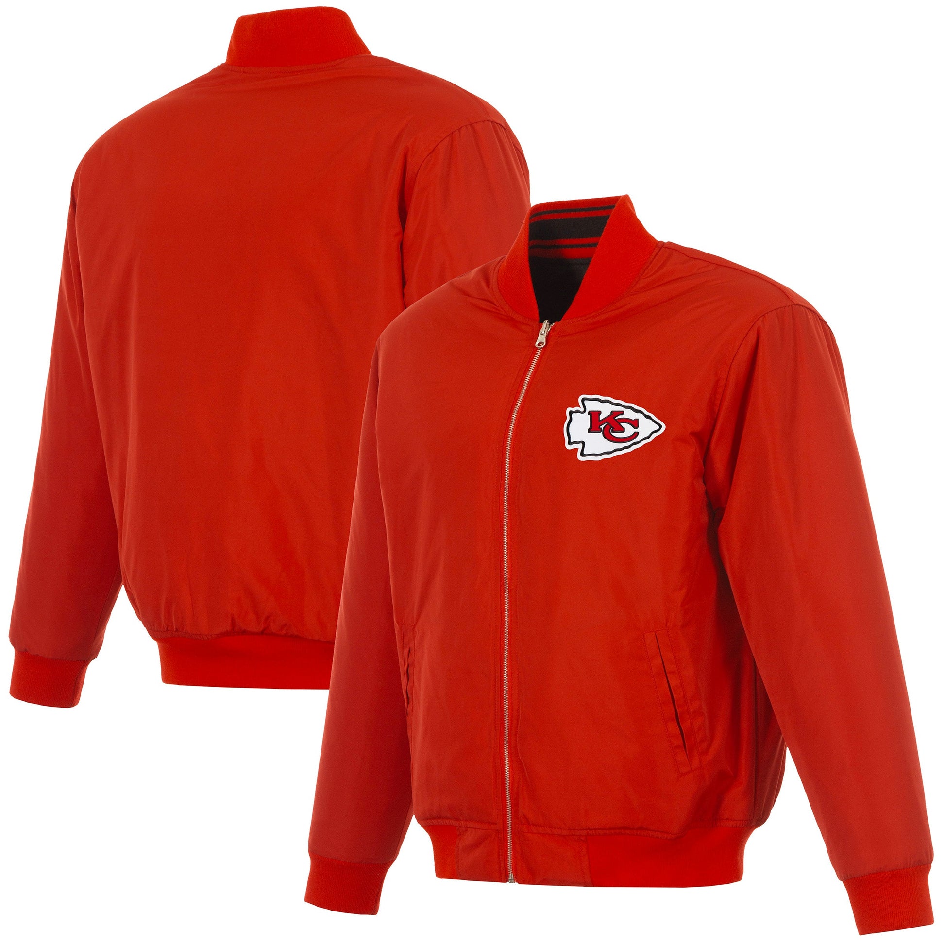 Kansas City Chiefs reversible nylon bomber in red and black with embroidered logos. Assembled in the USA. 100% Nylon, full length zip front.