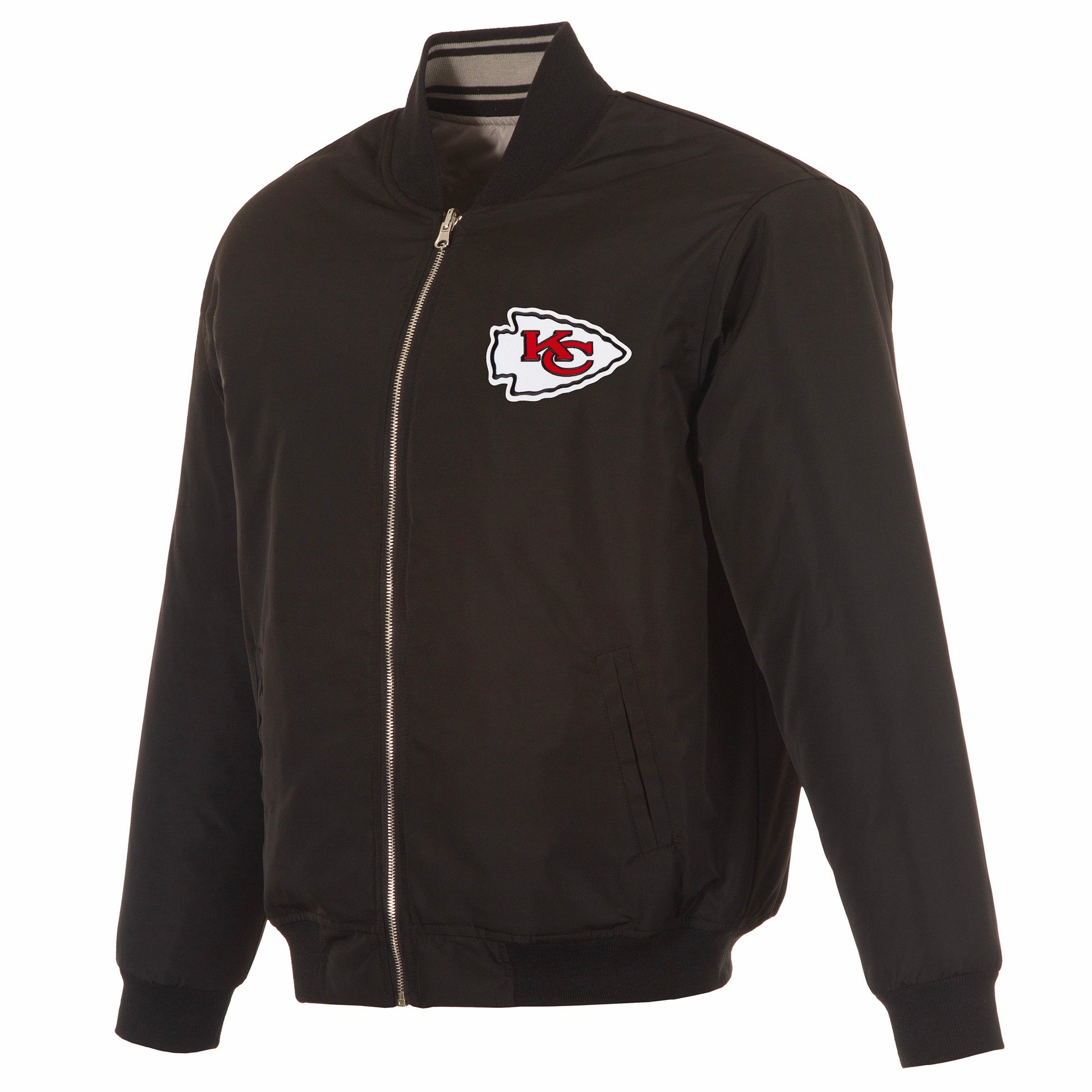 Kansas City Chiefs reversible nylon bomber in black and grey with embroidered logos. Assembled in the USA. 100% Nylon, full length zip front.
