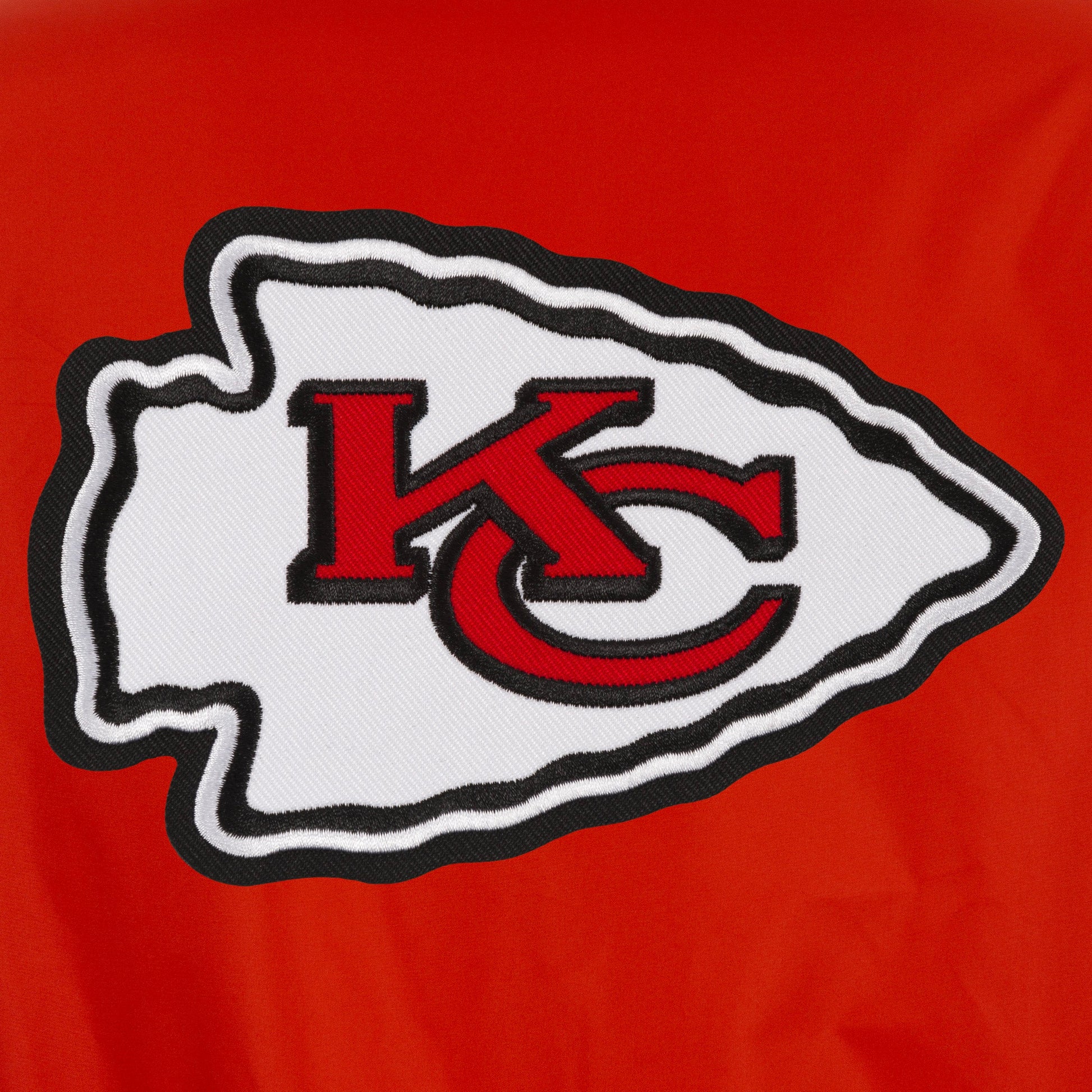 Kansas City Chiefs reversible fleece jacket with faux leather sleeves in red and white with embroidered logos. Assembled in the USA. 100% polyester body, faux leather sleeves, snap button closure.