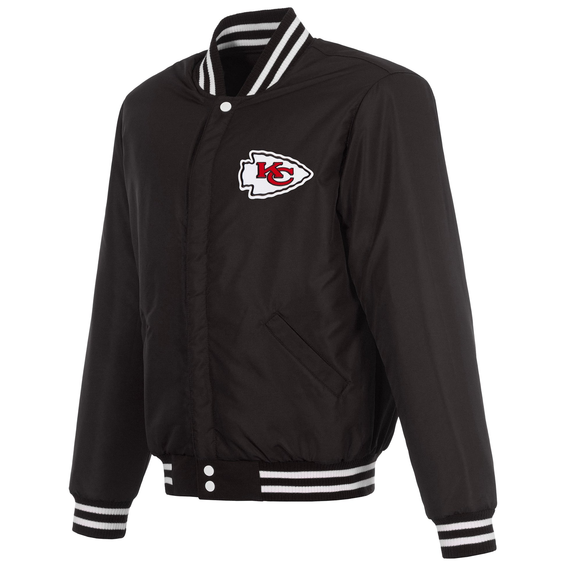 Kansas City Chiefs reversible fleece jacket with faux leather sleeves in black and white with embroidered logos. Assembled in the USA. 100% polyester body, faux leather sleeves, snap button closure.