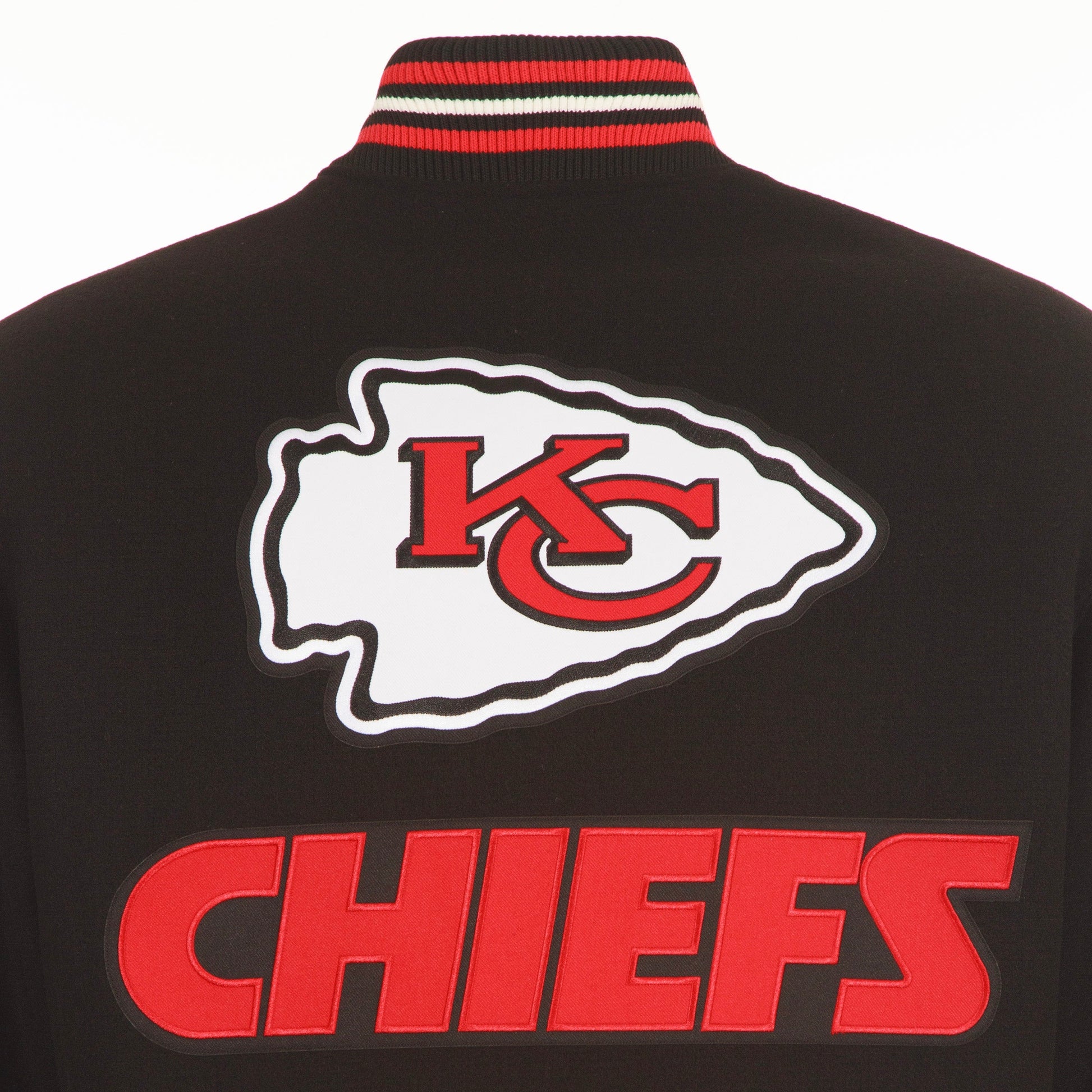 Kansas City Chiefs wool varsity jacket with quilted nylon lining in black and red. Embroidered team logos with red and white leather sport stripes. 55% wool 45% polyester body, traditional snap front closure.