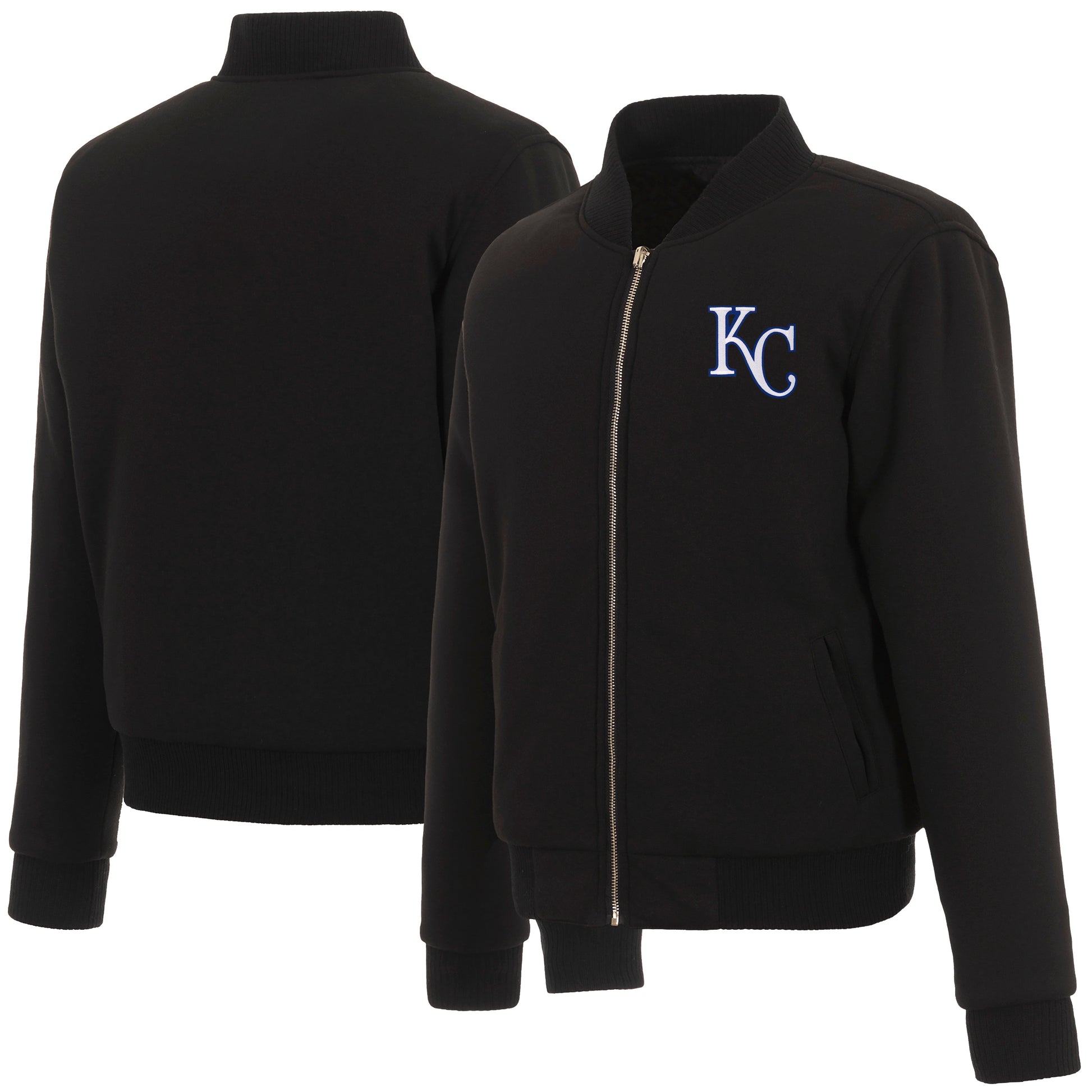 Kansas City Royals Ladies reversible fleece jacket in black with embroidered logos. Assembled in the USA. 100% polyester body, reverse nylon side, metal zip closure.