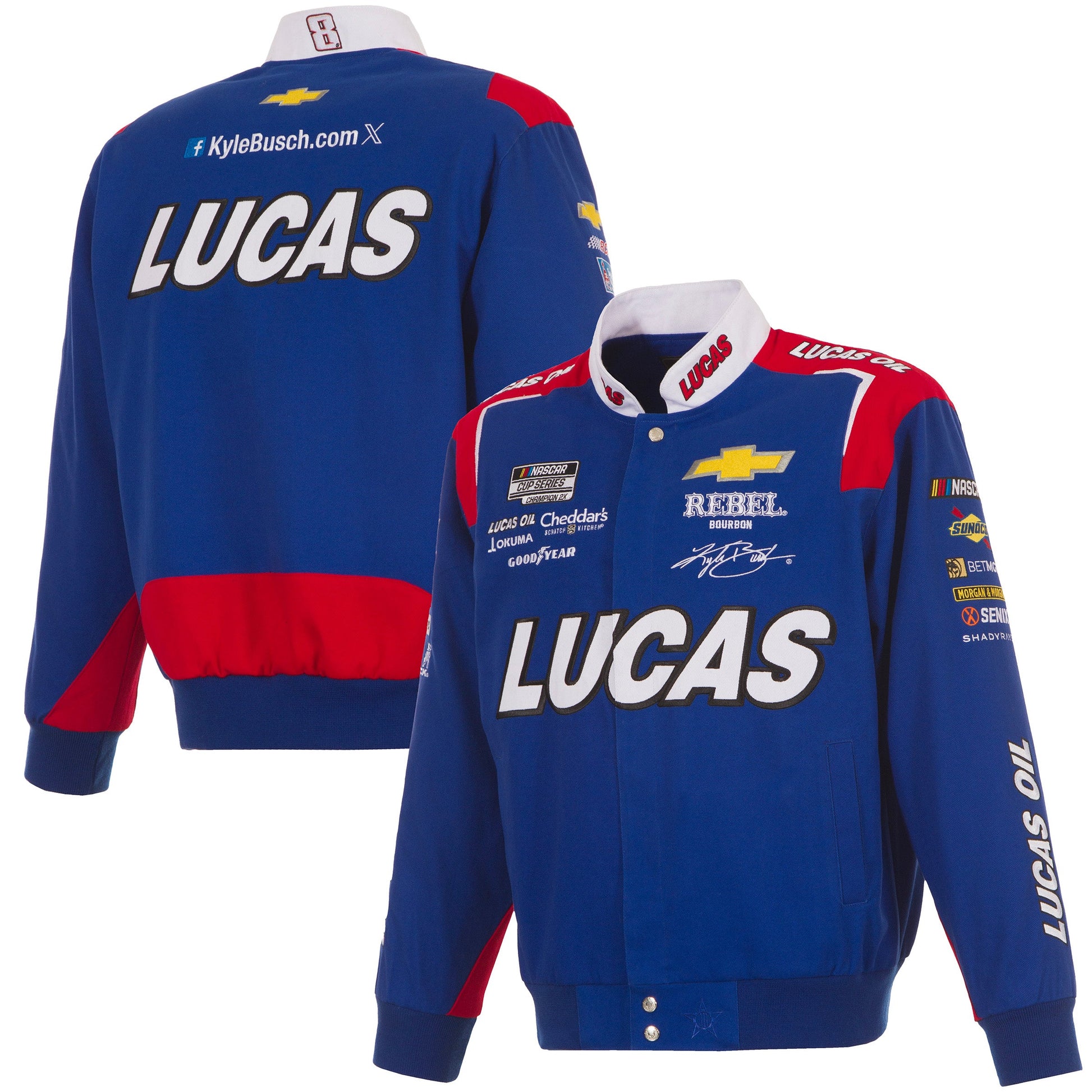 Kyle Busch Lucas Twill Jacket in royal with embroidered appliqué logos.