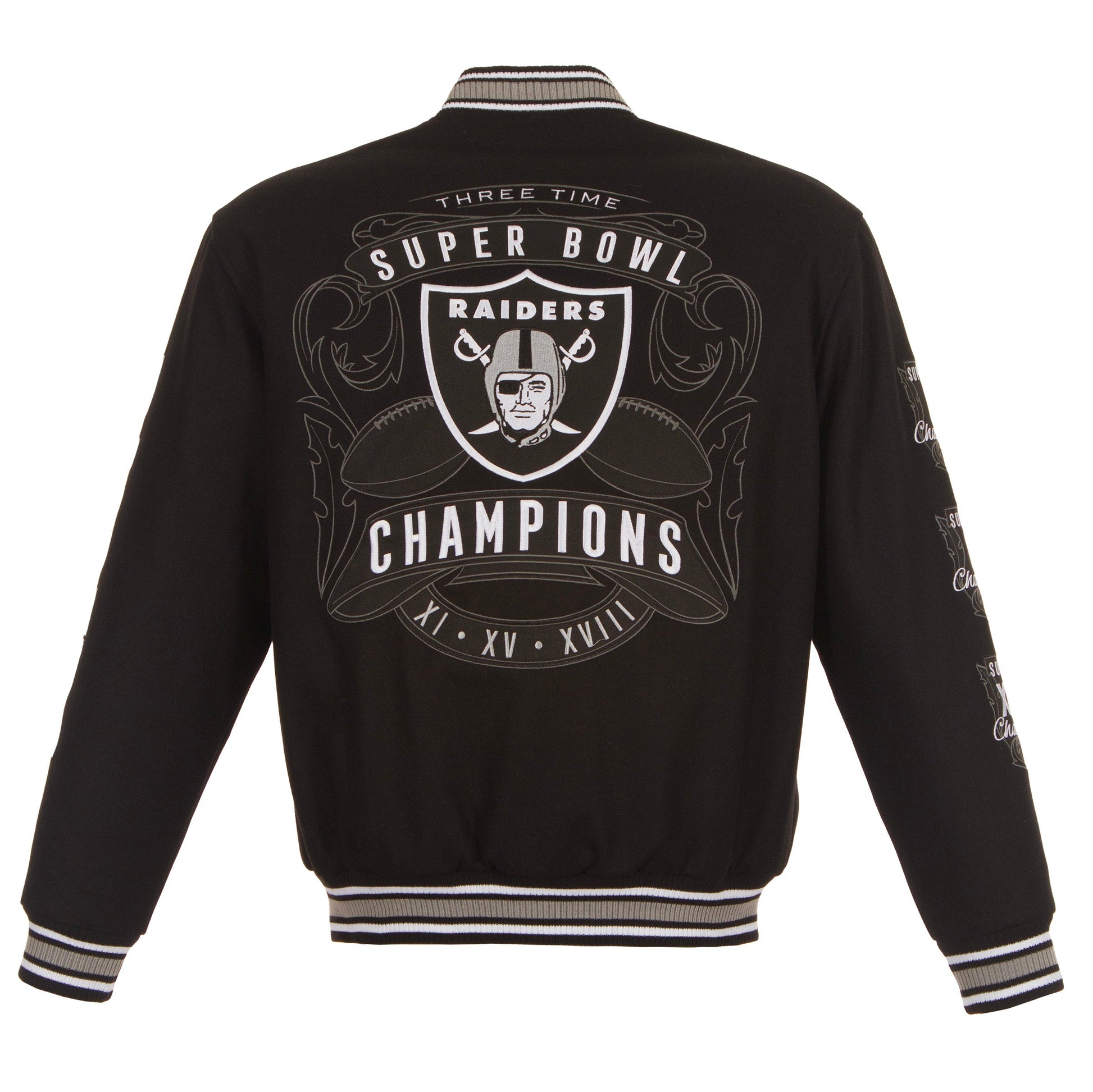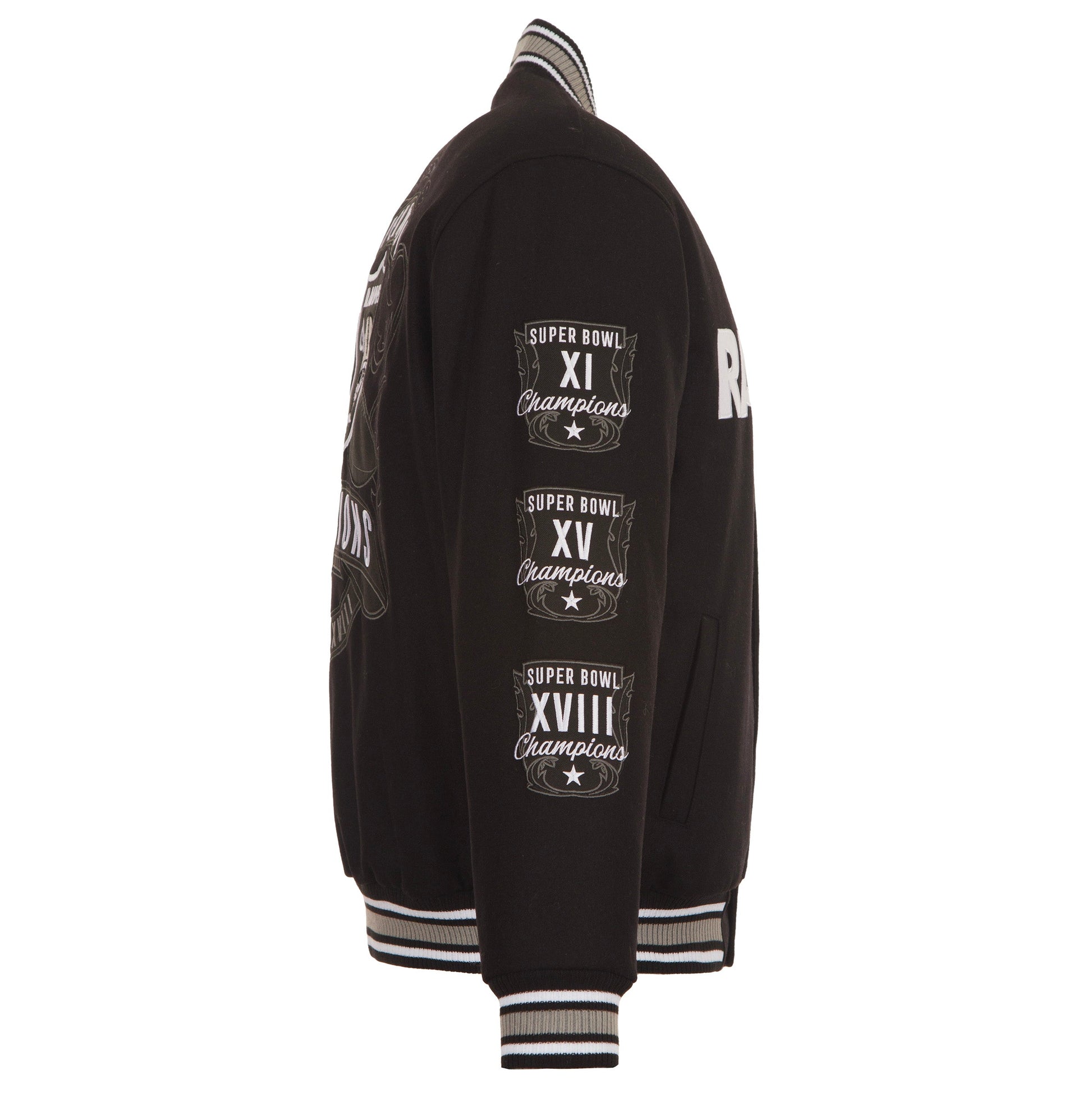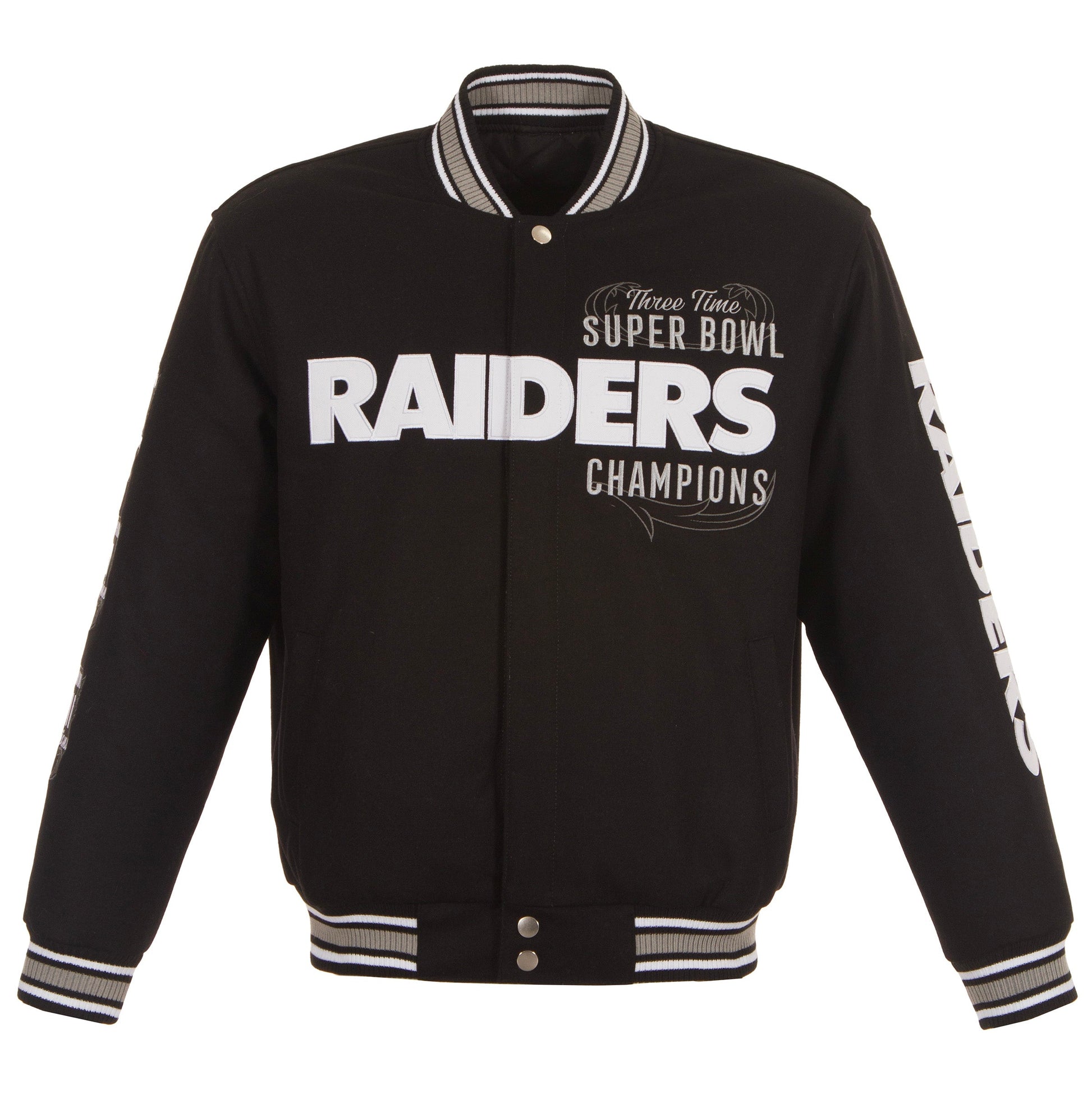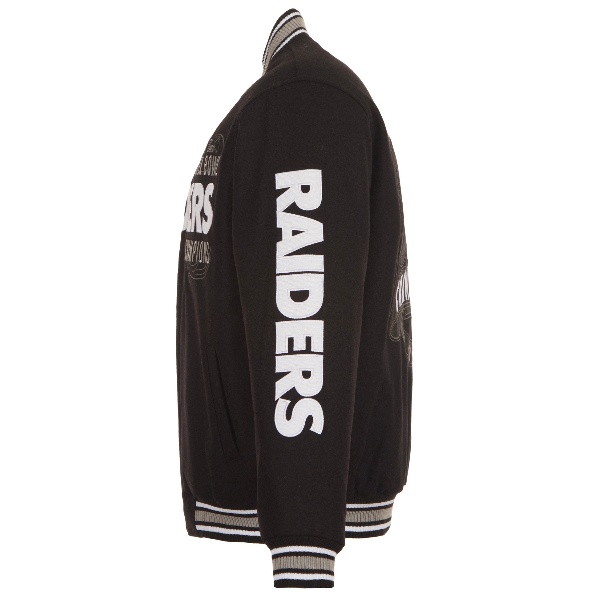 Las Vegas Raiders Wool Jacket in black with embroidered logos. 100% wool, snap button closure.