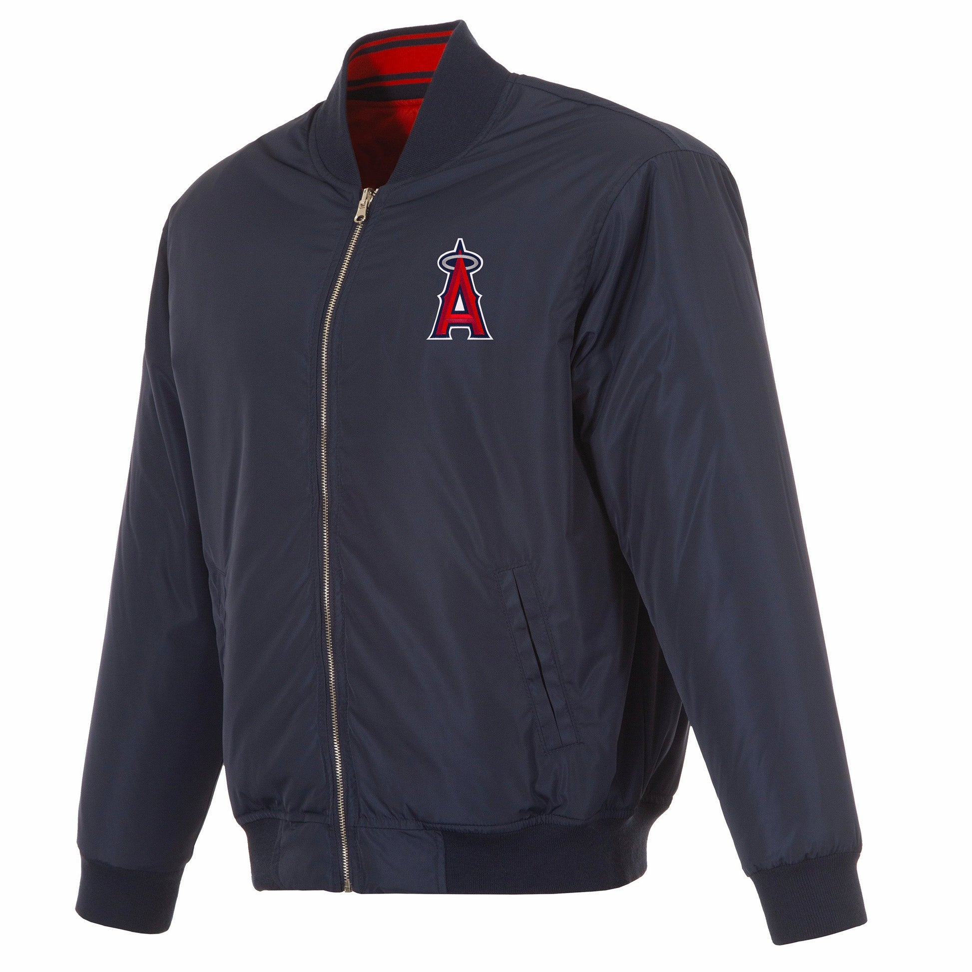 Los Angeles Angels reversible nylon bomber in navy and red with embroidered logos. Assembled in the USA. 100% Nylon, full length zip front.