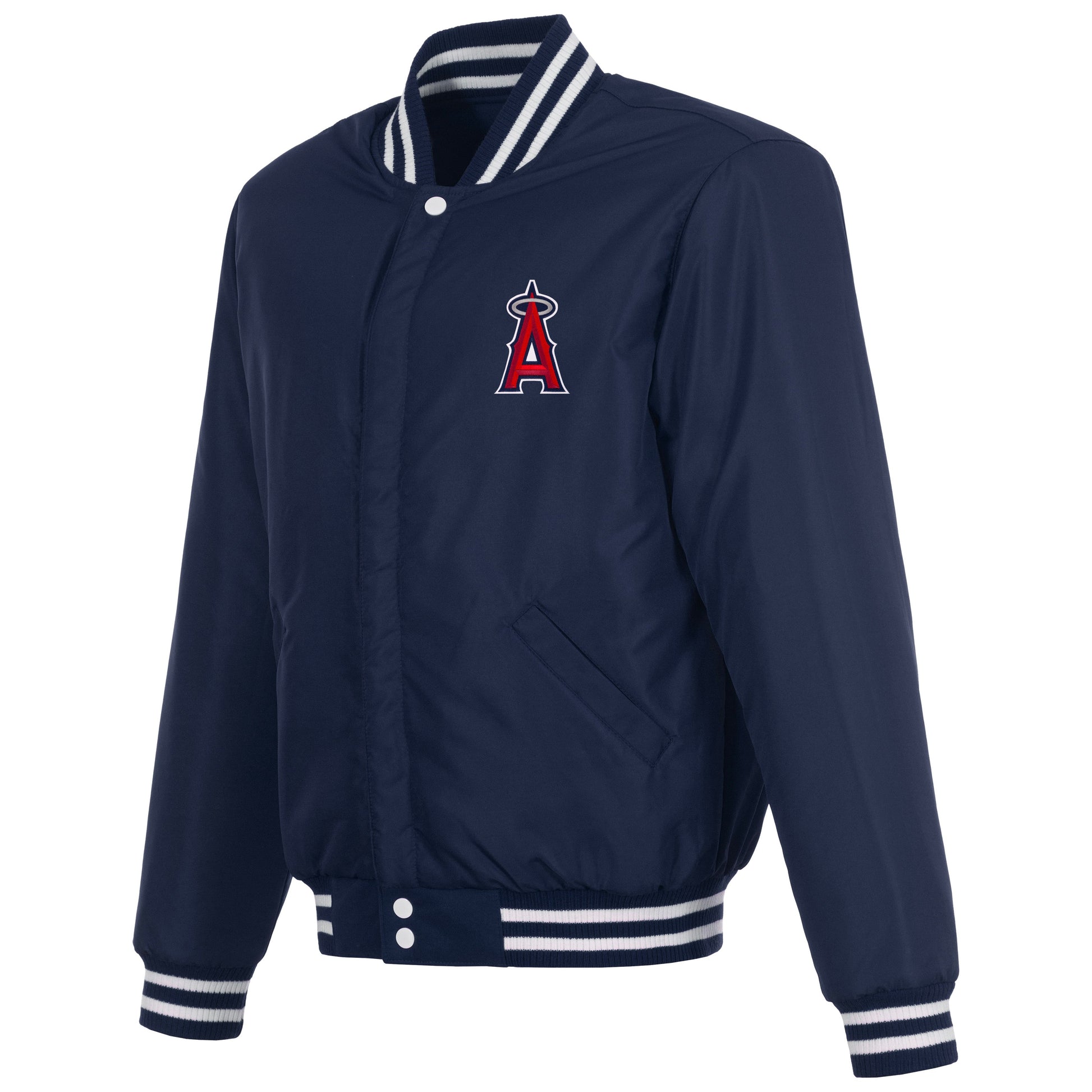 Los Angeles Angels reversible fleece jacket with faux leather sleeves in navy-white with nylon lining and embroidered logos.