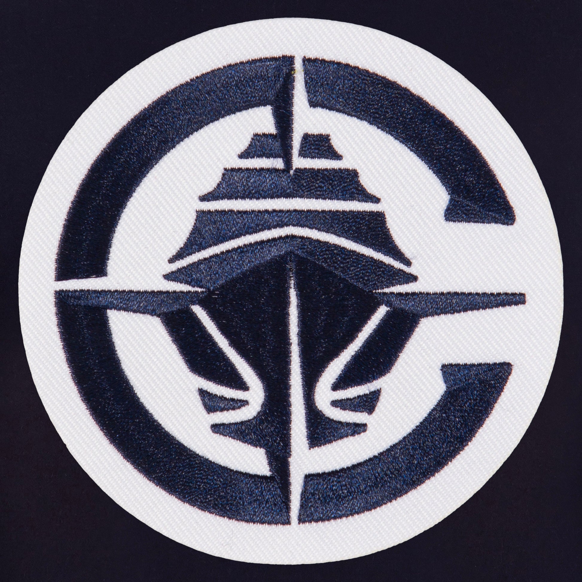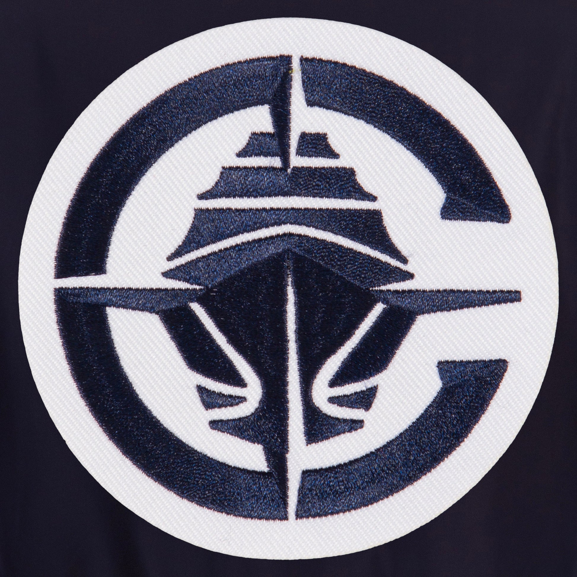 Los Angeles Clippers All Wool Jacket with nylon lining in navy with embroidered logos. Assembled in n the USA. 55% wool 45% polyester body. Snap button closure.