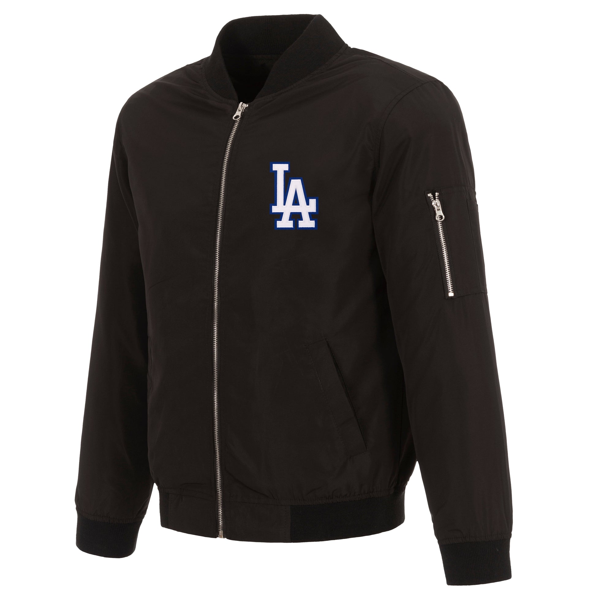 Los Angeles Dodgers nylon bomber in black with embroidered logos.