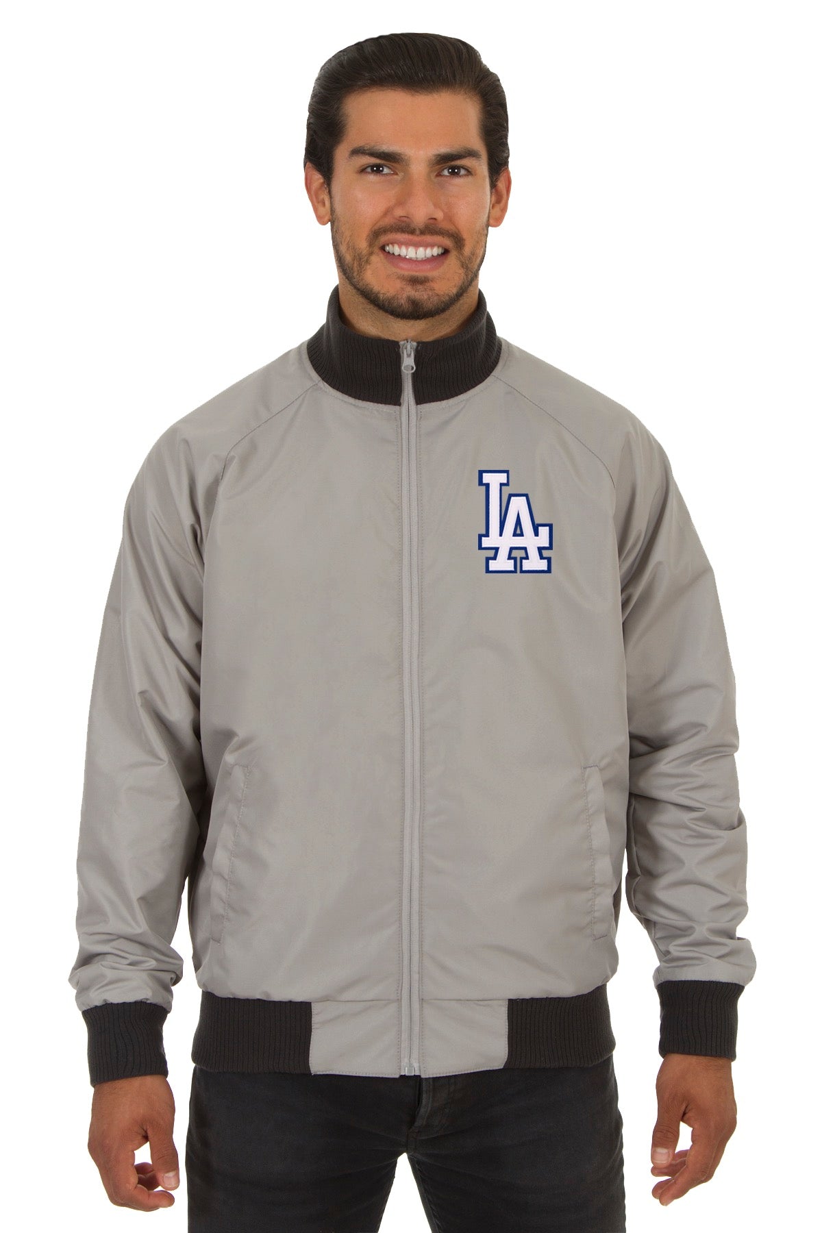 Los Angeles Dodgers reversible polyester track jacket in slate-gray with sublimated appliqué logos. Reverse side is nylon.