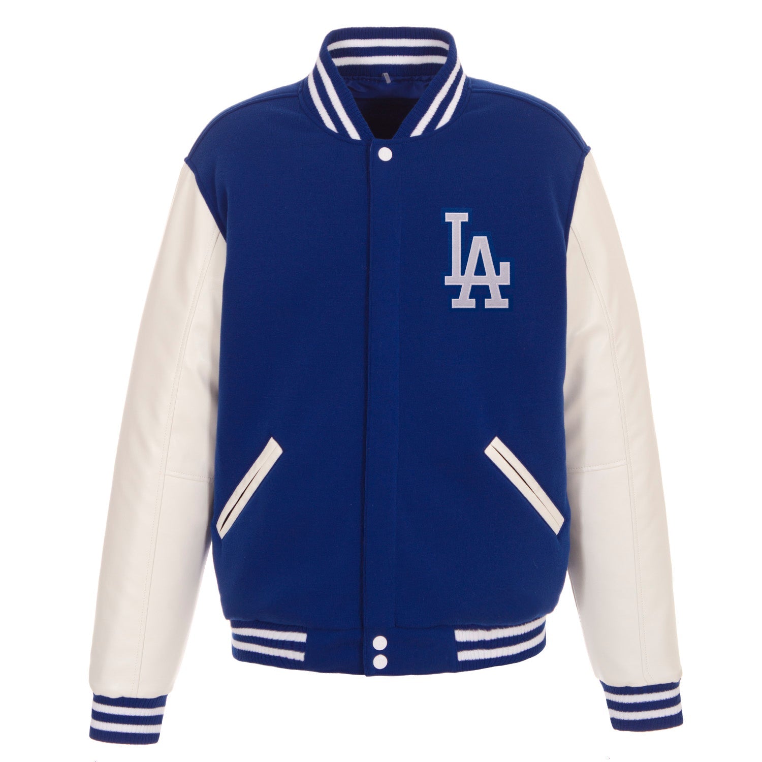 Los Angeles Dodgers reversible fleece jacket with Faux Leather sleeves in royal-white with nylon lining and embroidered logos.