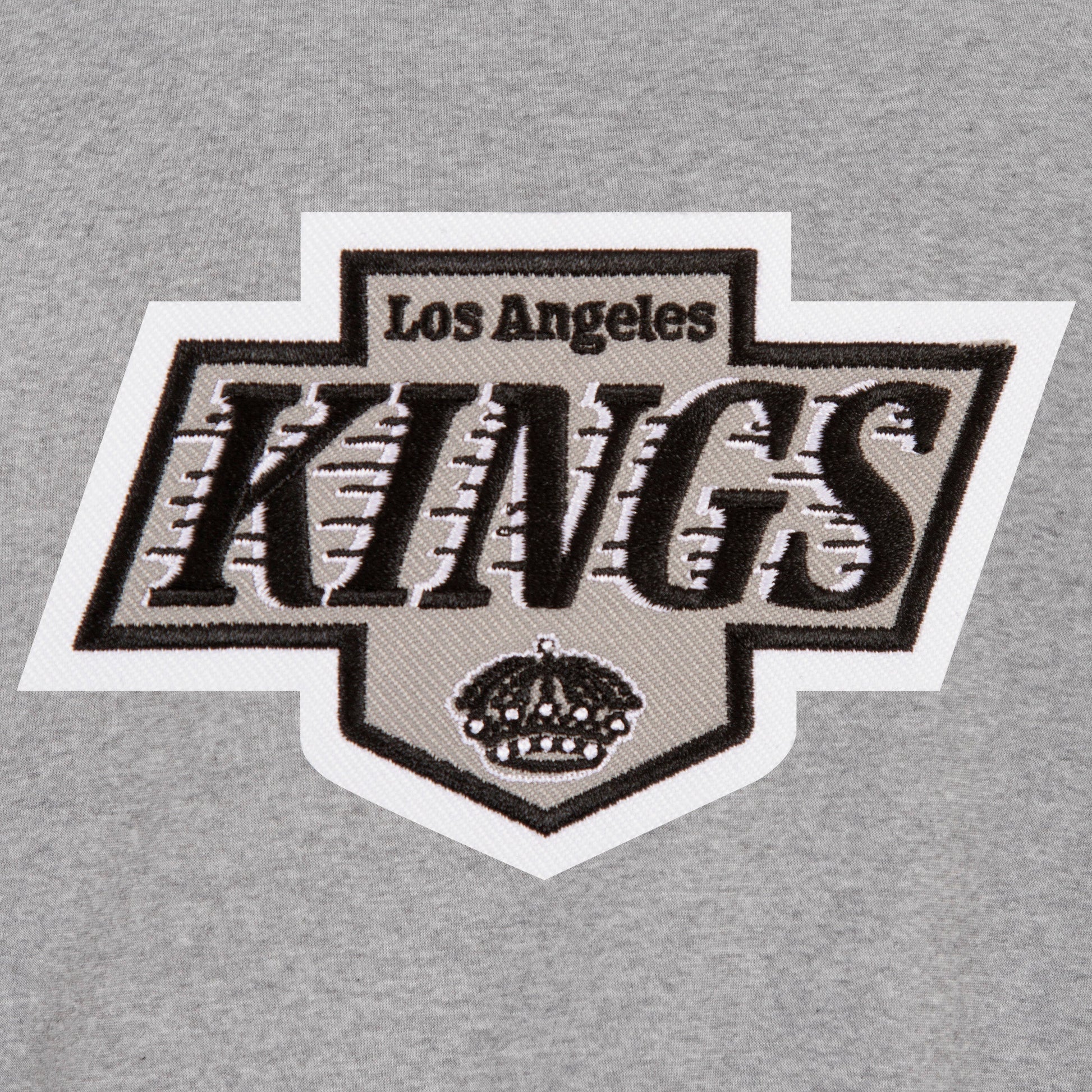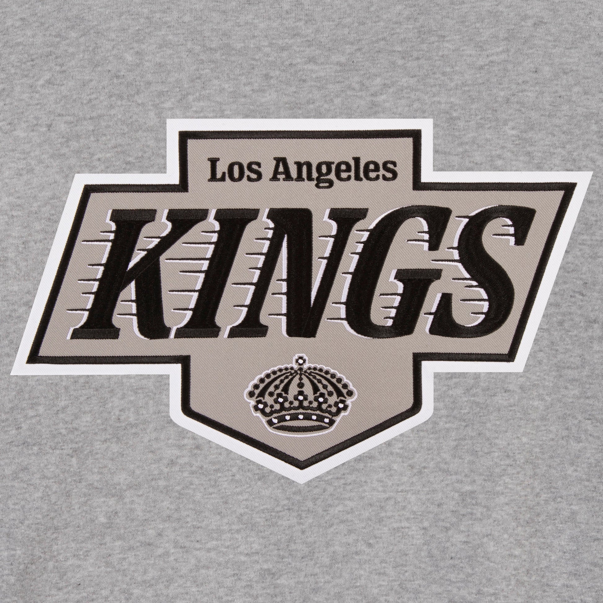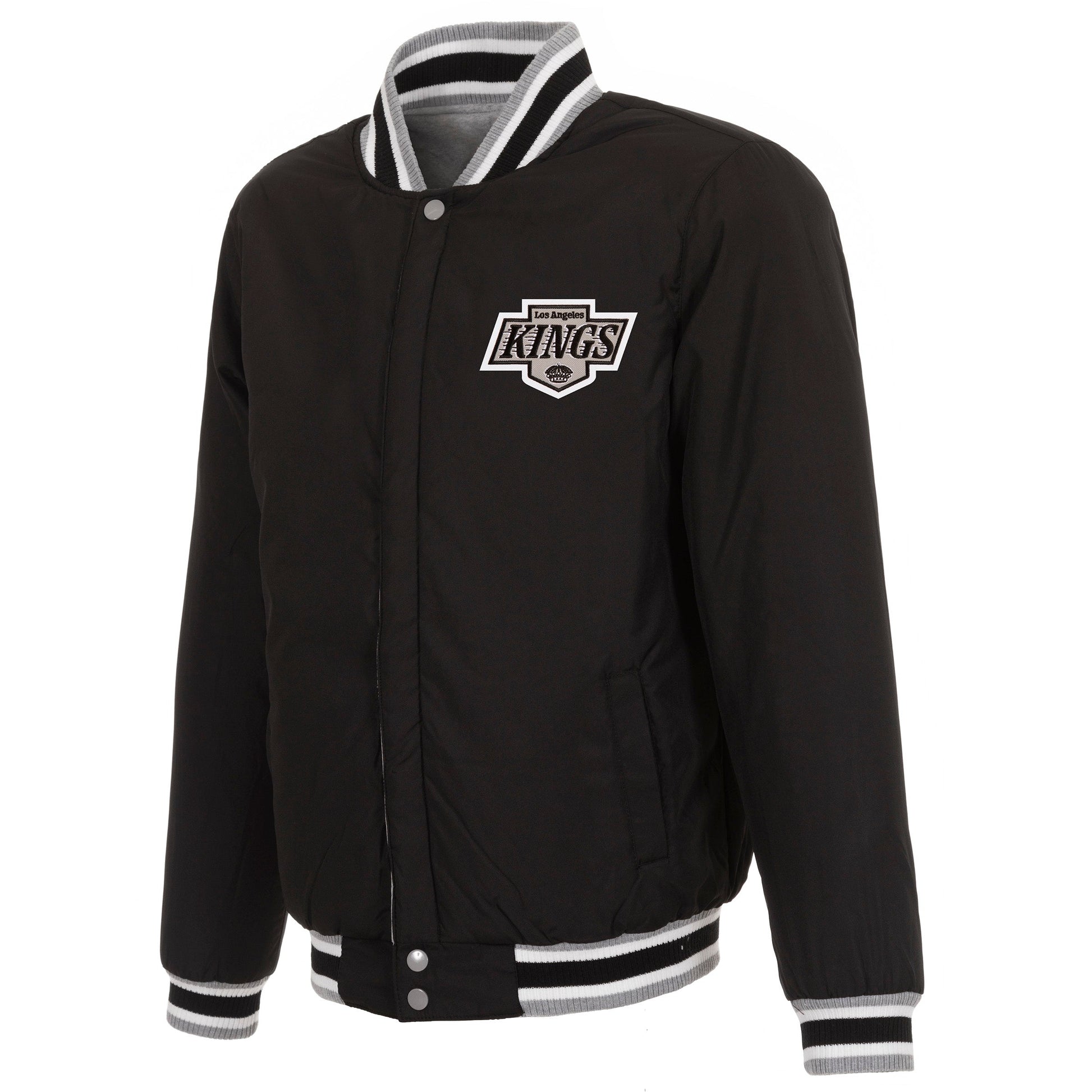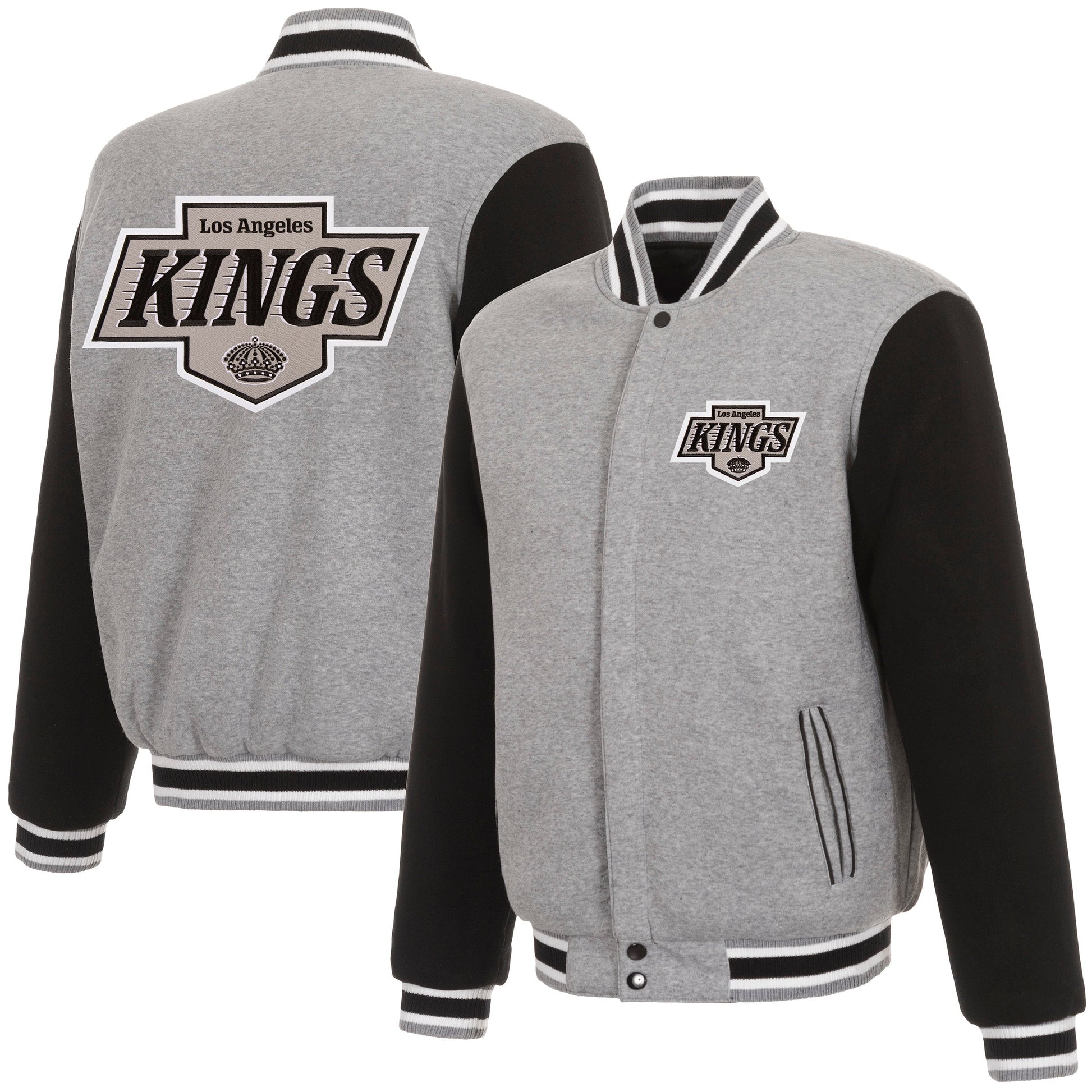 Los Angeles Kings reversible two-tone fleece jacket in grey and black with embroidered logos. Assembled in the USA. 100% polyester body, reverse nylon side, snap button closure.