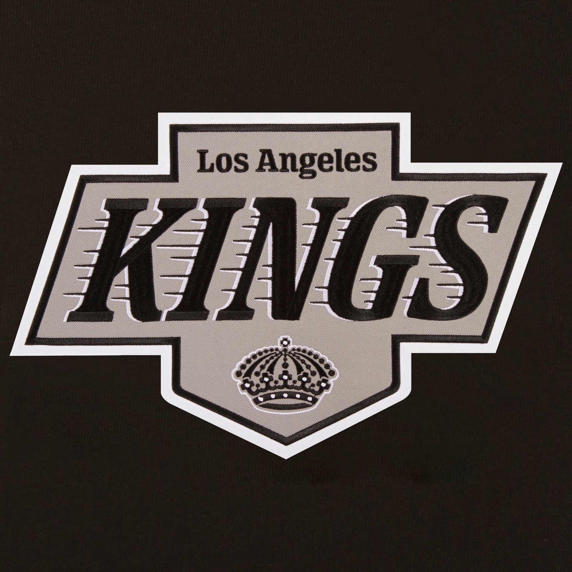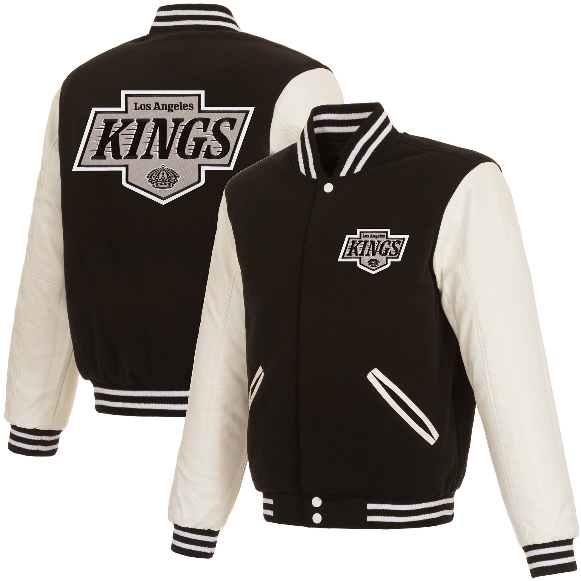 Los Angeles Kings reversible fleece jacket with faux leather sleeves in black and white with embroidered logos. Assembled in the USA. 100% Polyester body, faux leather sleeves, snap button closure.