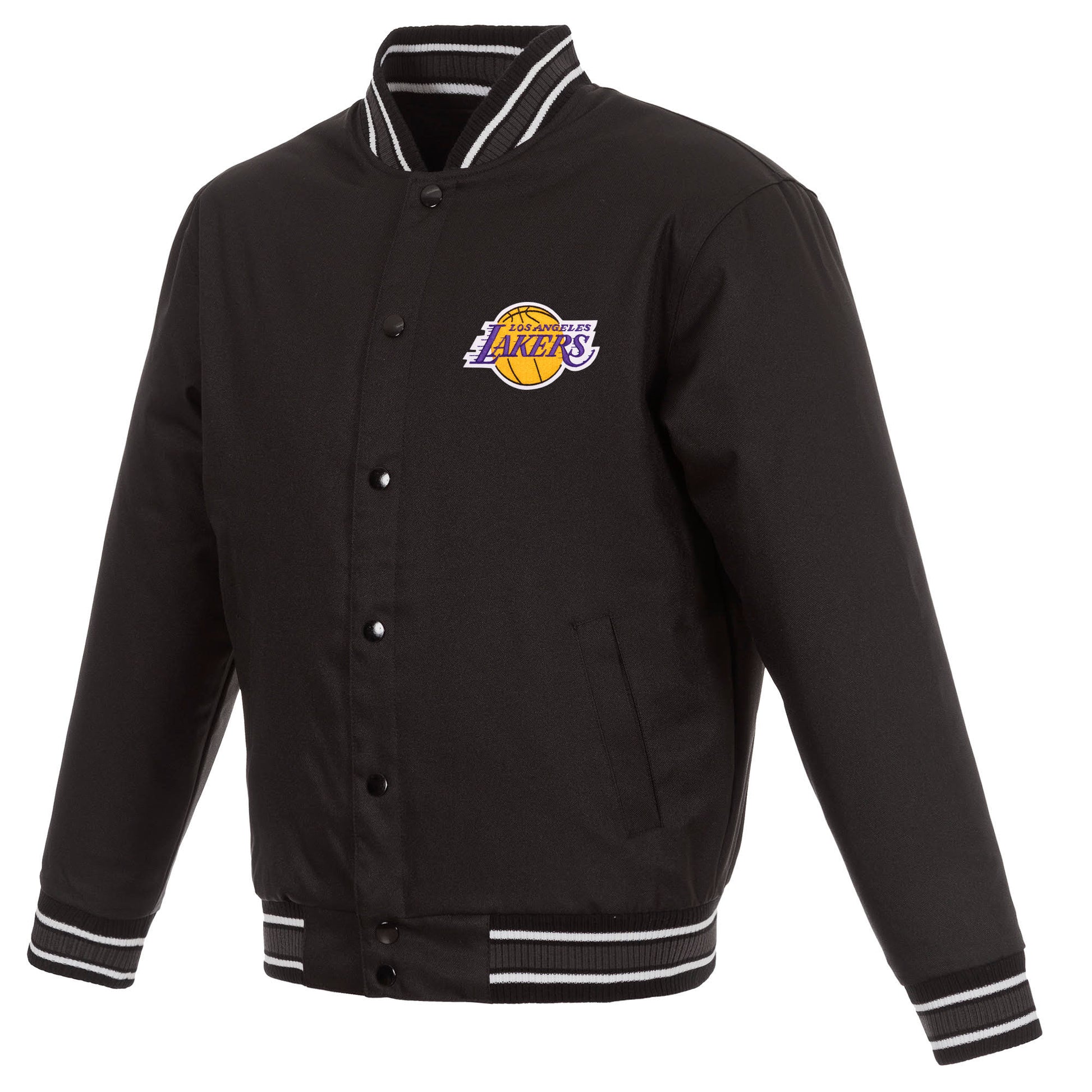 Los Angeles Lakers poly-twill jacket in black with quilted nylon lining and embroidered appliqué logos. (Front and Back Logo)