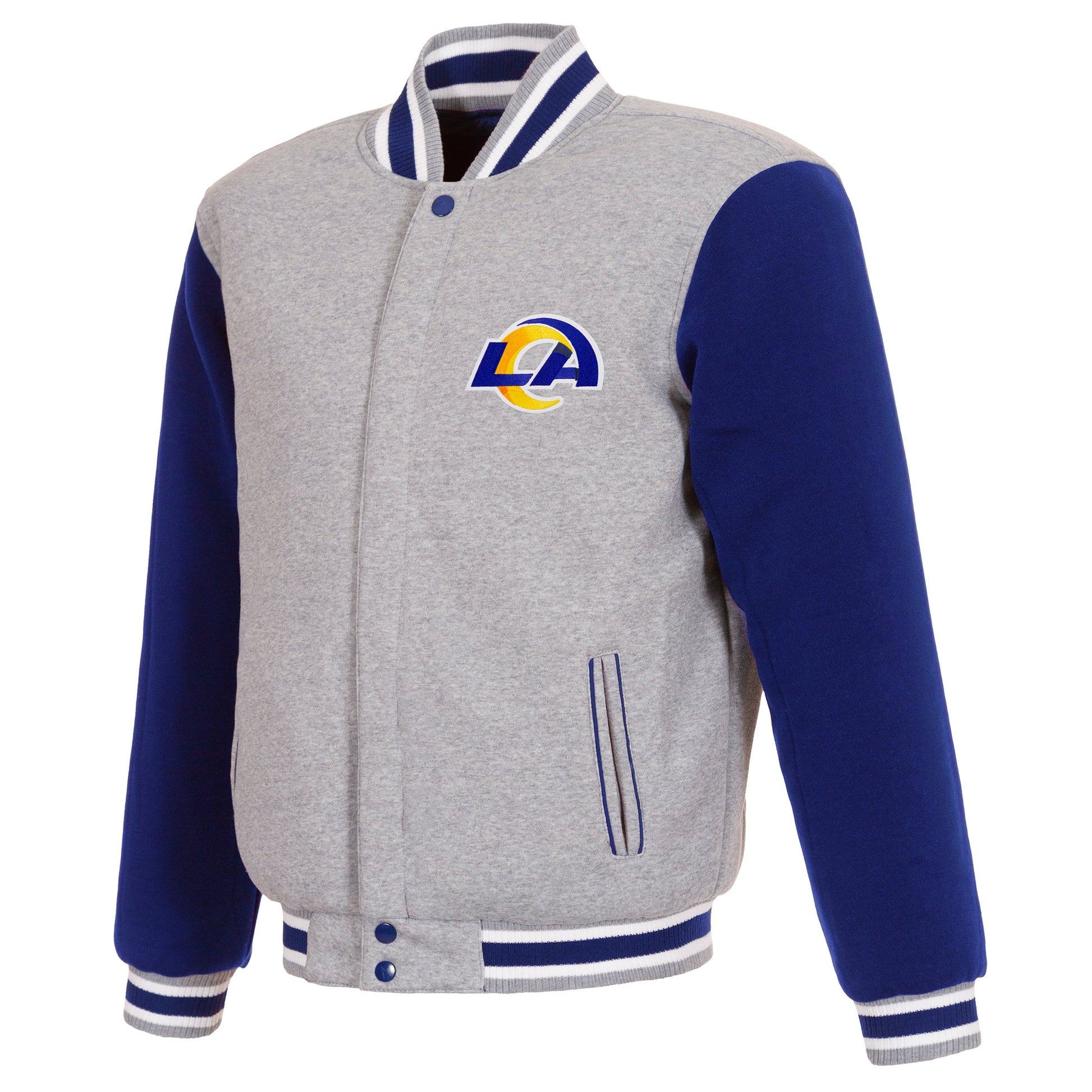 Los Angeles Rams reversible two-tone fleece jacket in grey and royal with embroidered logos. Assembled in the USA. 100% polyester body, reverse nylon side, snap button closure.