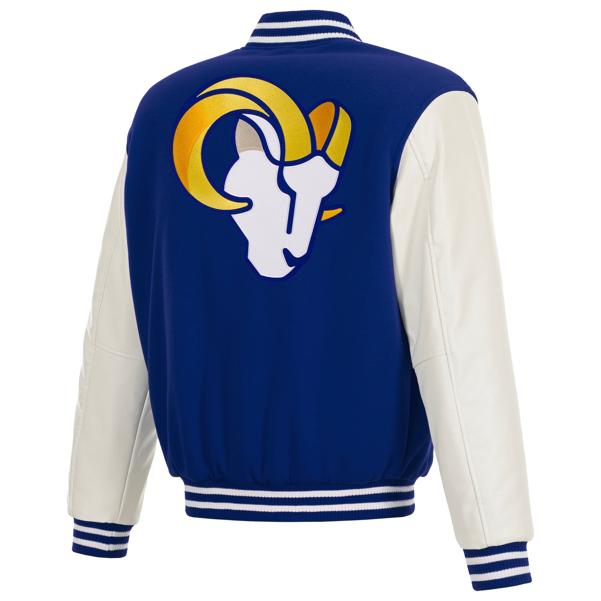 Los Angeles Rams reversible fleece jacket with faux leather sleeves in royal and white with embroidered logos. Assembled in the USA. 100% polyester body, faux leather sleeves, snap button closure.